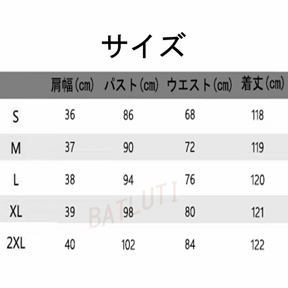 サイズ(cm):S、M、L、XL、XXL S:肩幅:36CM バスト:86CM 着丈:118CM ウエスト:68CM