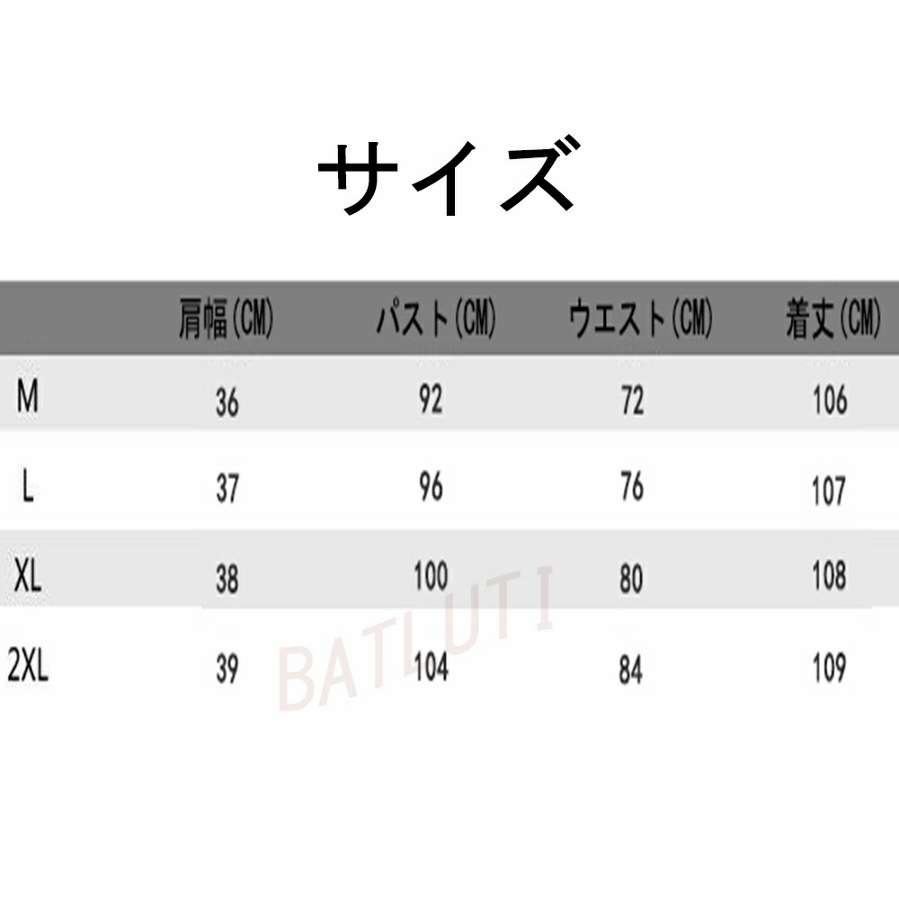 サイズ(cm):M、L、XL、XXL M:肩幅:36CM バスト:92CM 着丈:106CM ウエスト:72CM