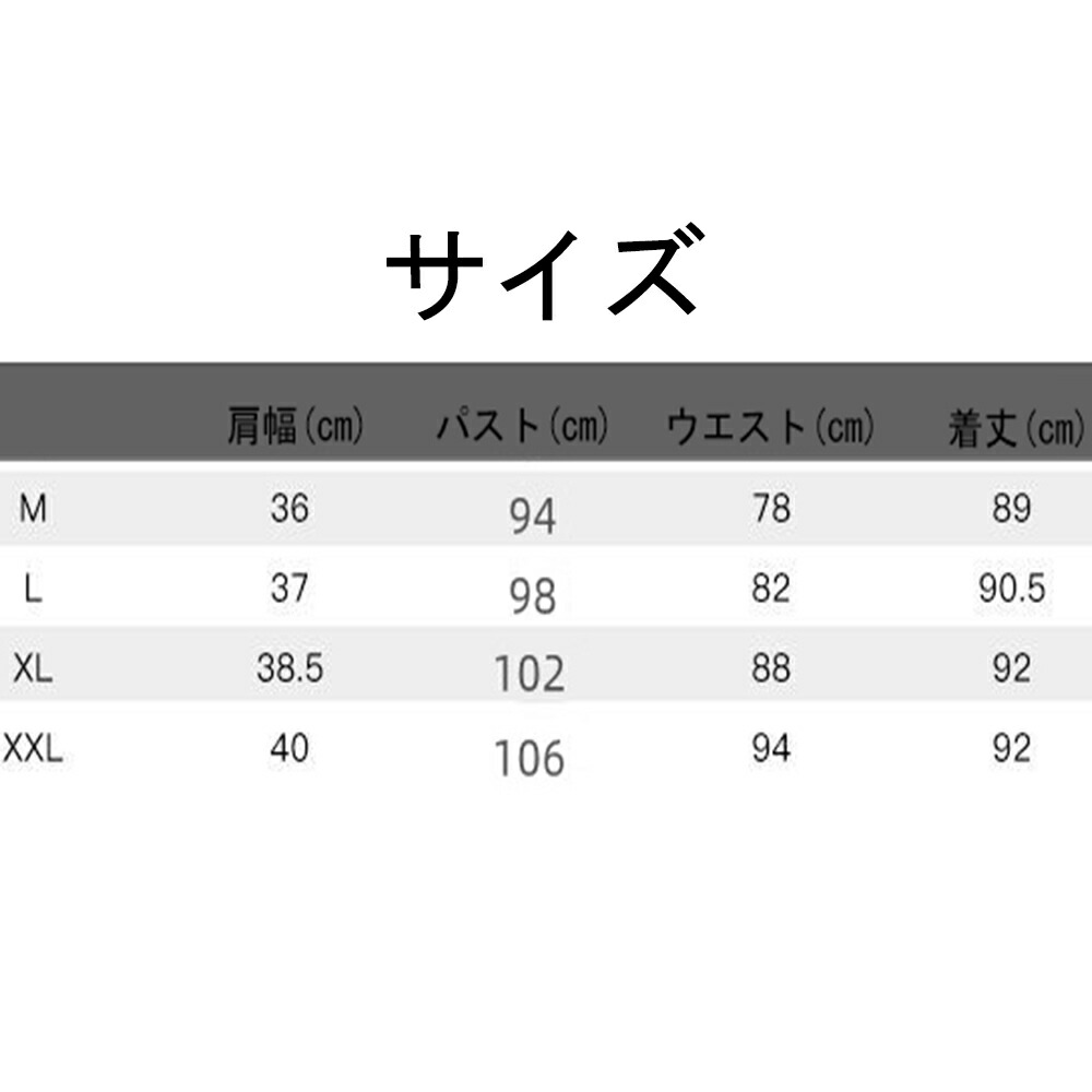 サイズ(cm):M、L、XL、XXL M: 着丈89cm バスト94cm ウエスト78cm 肩幅36cm
