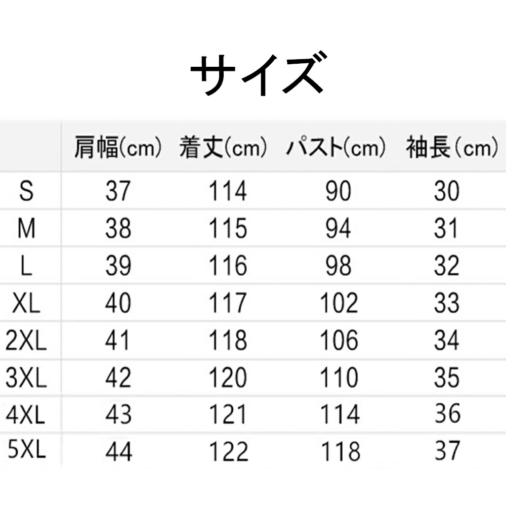 サイズ(cm):S、M、L、XL、XXL、XXXL、XXXXL、XXXXXL S: 着丈114cm バスト86cm ウエスト70cm 肩幅36cm