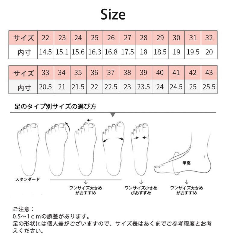 サイズ: 22(内寸14.5cm) 23(内寸15.1cm) 24(内寸15.6cm) 25(内寸16.3cm) 26(内寸16.8cm) 27(内寸17.5cm) 28(内寸18cm) 29(内寸18.5cm) 30(内寸19cm) 31(内寸19.5cm) 32(内寸20cm) 33(内寸20.5cm) 34(内寸21cm) 35(内寸21.5cm) 36(内寸22cm) 37(内寸22.5cm) 38(内寸23cm) 39(内寸23.5cm) 40(内寸24cm) 41(内寸24.5cm) 42(内寸25cm) 43(内寸25.5cm)