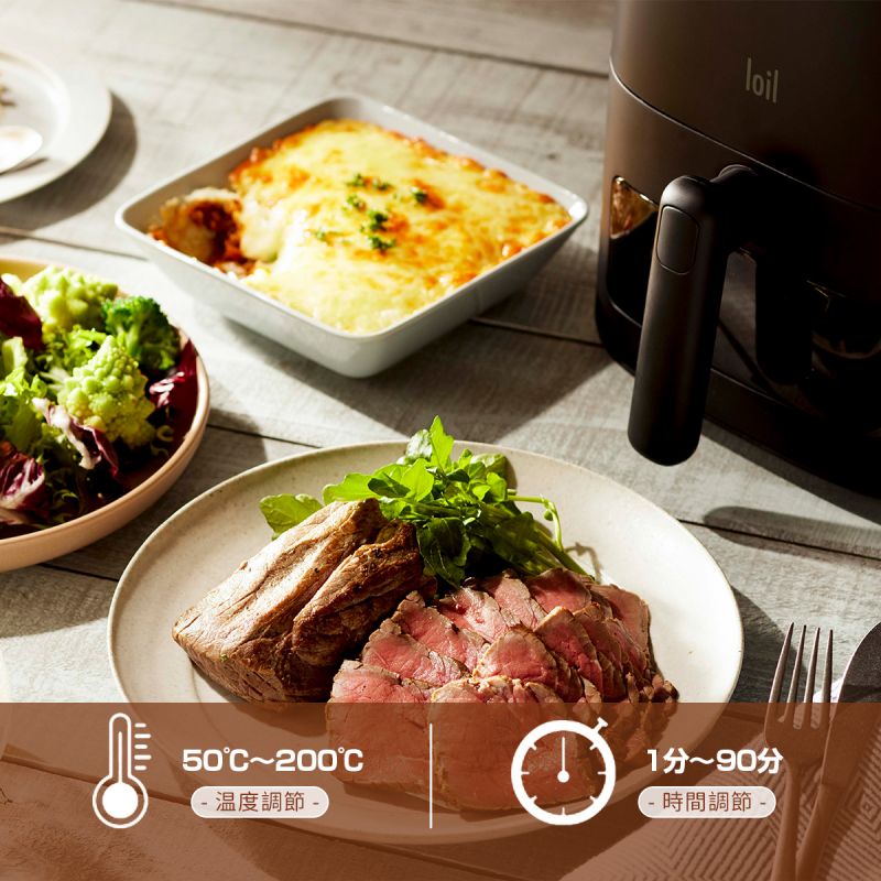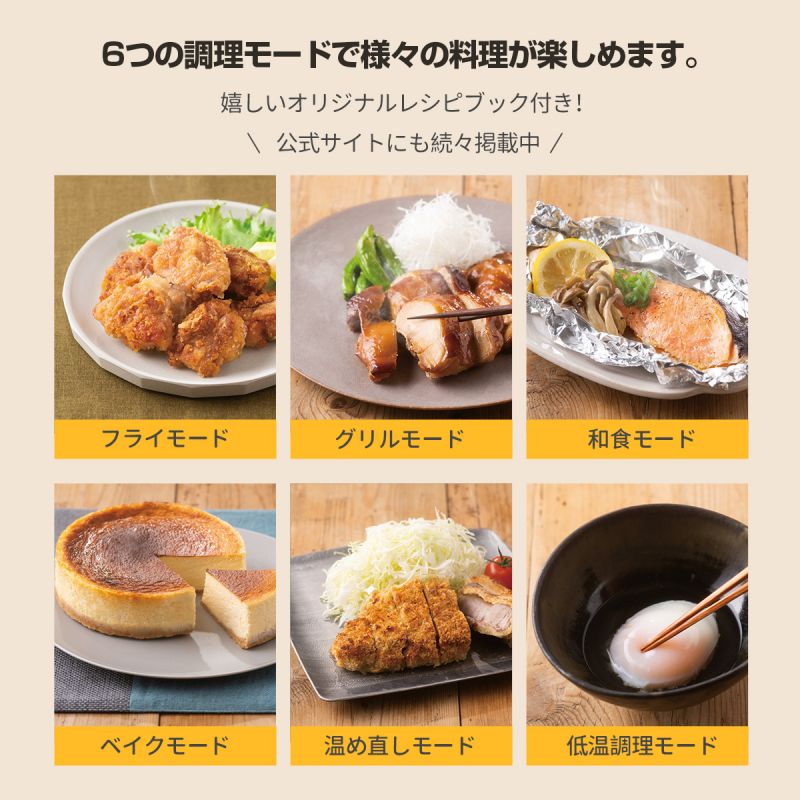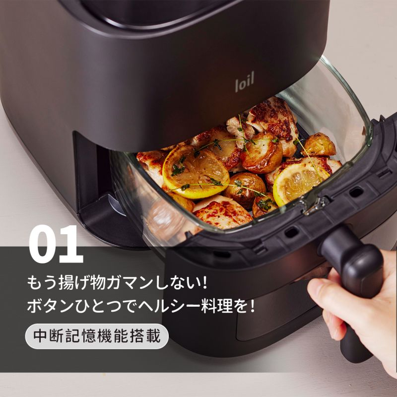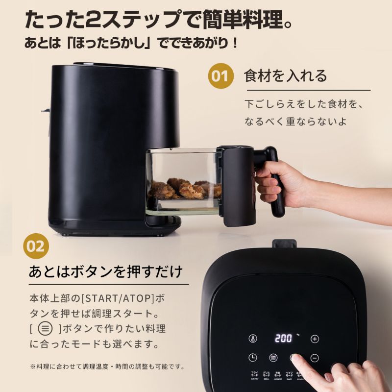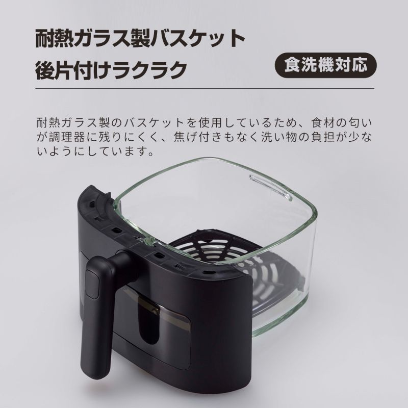 【使い道たくさん】唐揚げやトンカツなどの揚げ物をヘルシーに調理できる「ノンフライ」機能はもちろん、「ロースト」・「ベイク」・「温め直し」など様々な調理モードを楽しめます。デザートがお好みの方はベイクモードで手軽にケーキを作れます。ローストモードでは、ステーキや焼き魚などをより良い焼き加減で仕上がります。さらに、スーパーで買ったお惣菜などをサクサクの食感に復活させる「温め直し」モードも完備しています。※食材を予熱する必要がある場合、何も入れずにエアフライヤーの温度を調理したい温度まで温めておきましょう。カラー ブラック/ホワイトサイズ /仕様 1200W原産国 中国注意事項 ※お客様のご覧になるパソコン機器及びモニタなどの違い、また室内、室外での撮影により、実際の商品素材の色と相違する場合がございます。