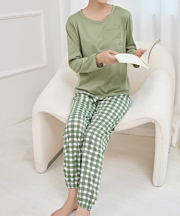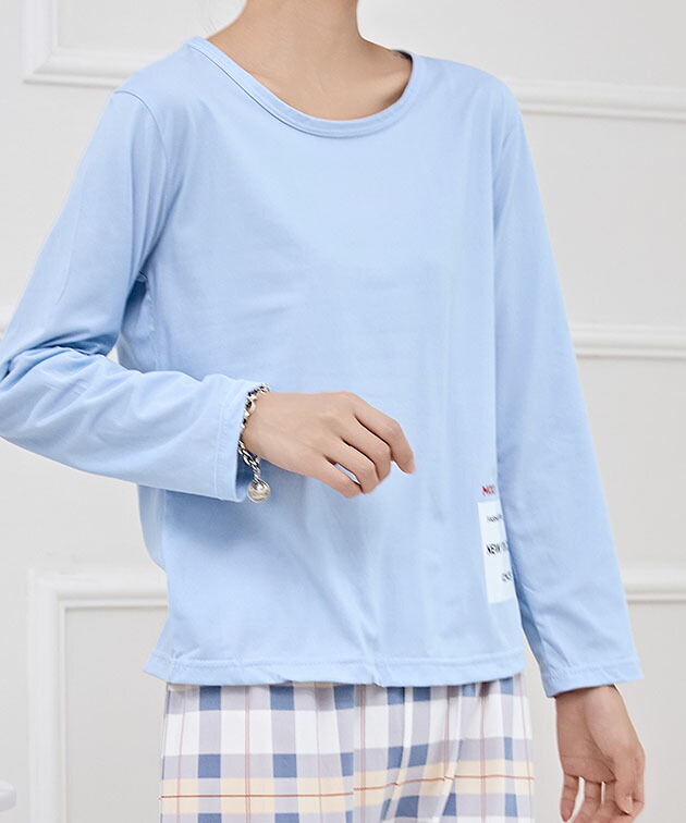 ラウンドネック 配色 チェック 長袖