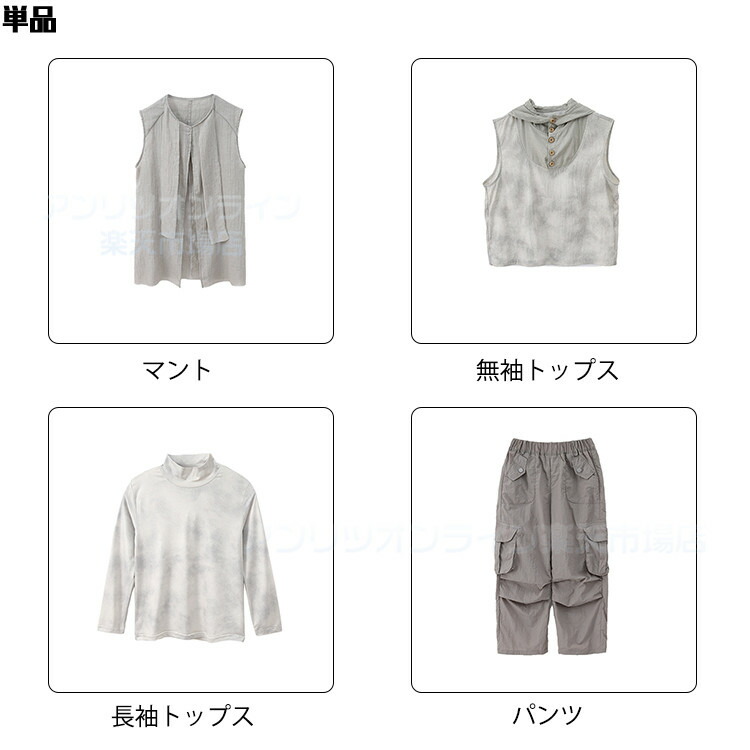 vertical-key: マントのみ 無袖トップスのみ 長袖トップスのみ パンツのみ 無袖トップス+パンツ マント+パンツ 長袖トップス+パンツ 無袖トップス+長袖トップス+パンツ マント+長袖トップス+パンツ 4点セット