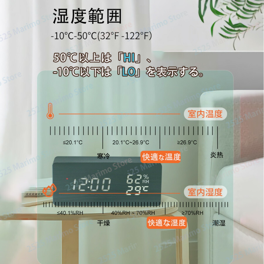 時刻や日付表示だけでなく、室内の温度管理もこの置き時計で一括管理してくれてとても便利!インフルエンザや風邪などの予防対策、熱中症対策などに参考になって役立ちます。