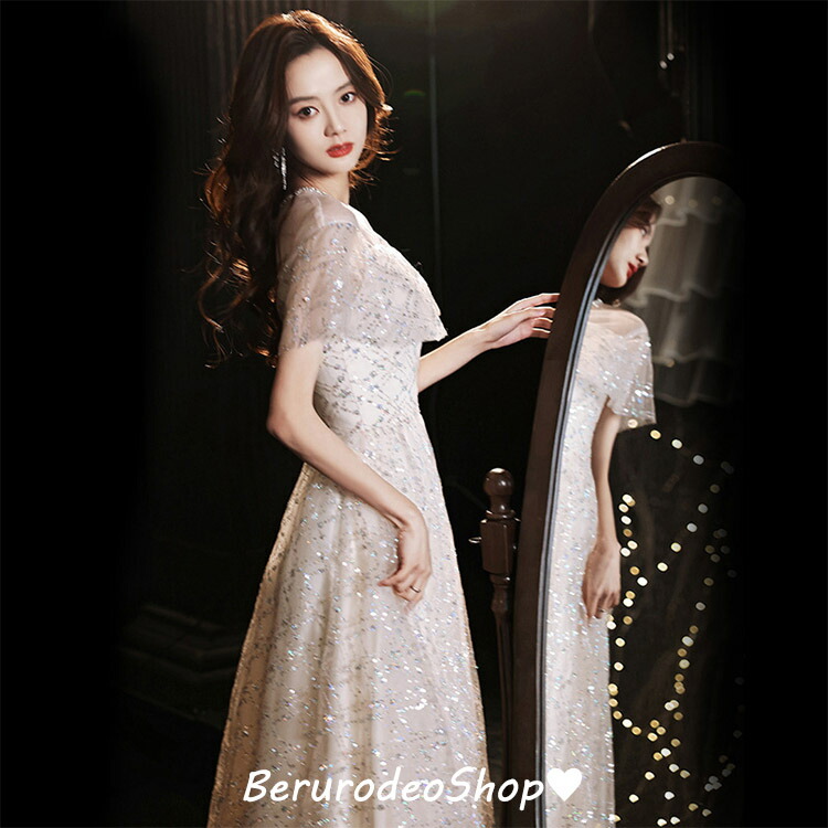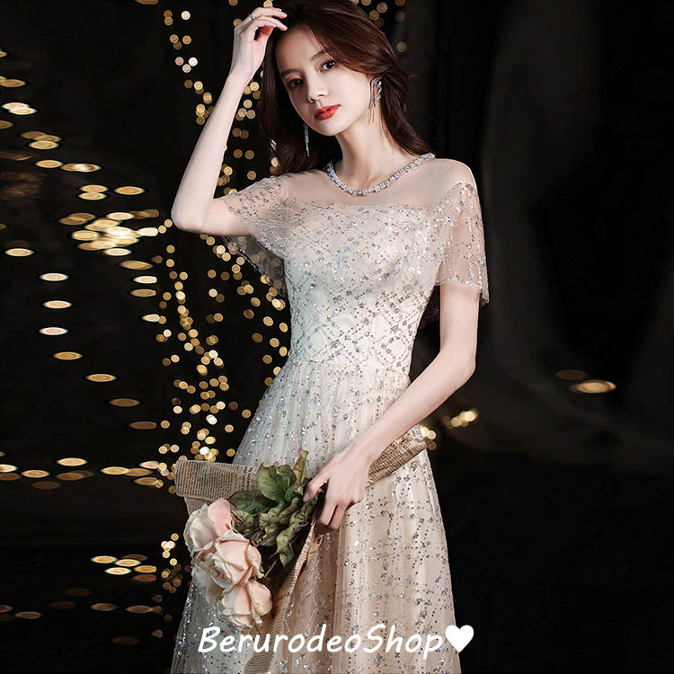 イブニングドレス キラキラドレス スパンコール ラインストーン キレイめ 発表会ドレス ロングドレス パーティードレス シャンパン色 結婚式ドレス 二次会ドレス お呼ばれドレス 成人式ドレス ミモレ丈 ロング丈 2タイプ 送料無料