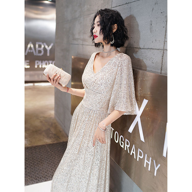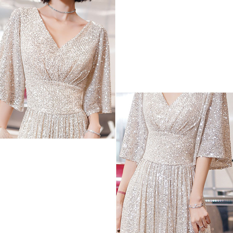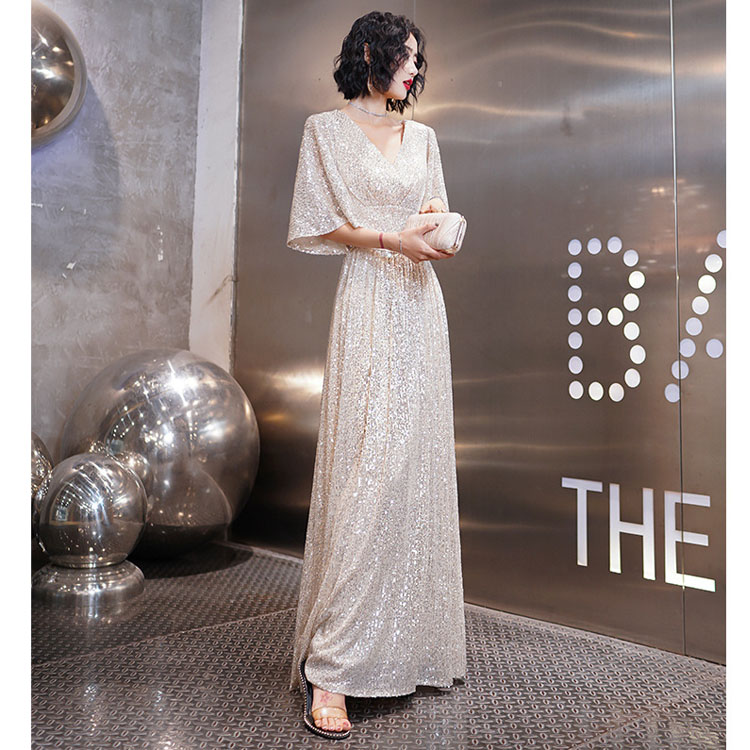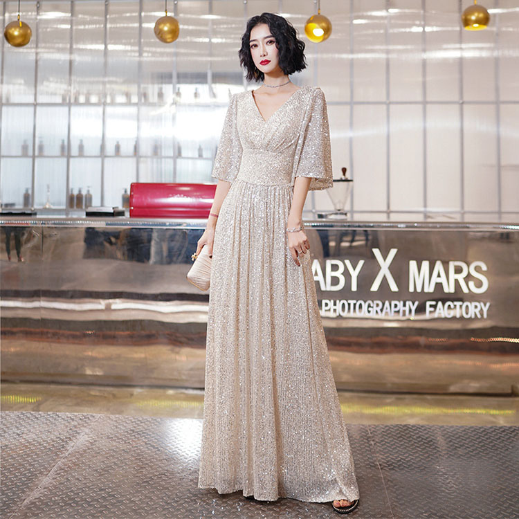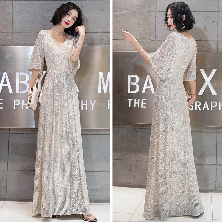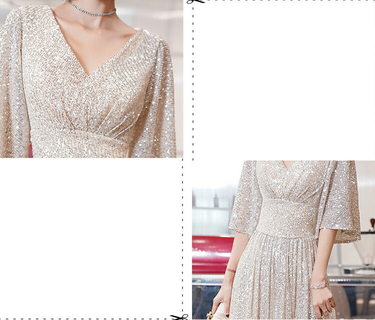 送料無料 イブニングドレス スパンコール キラキラドレス シルバー 発表会ドレス ロングドレス Vネック 着瘦せ パーティードレス 銀色 5分袖 結婚式ドレス 二次会ドレス 大きいサイズ Aライン ロング S M L XL XXL XXXL