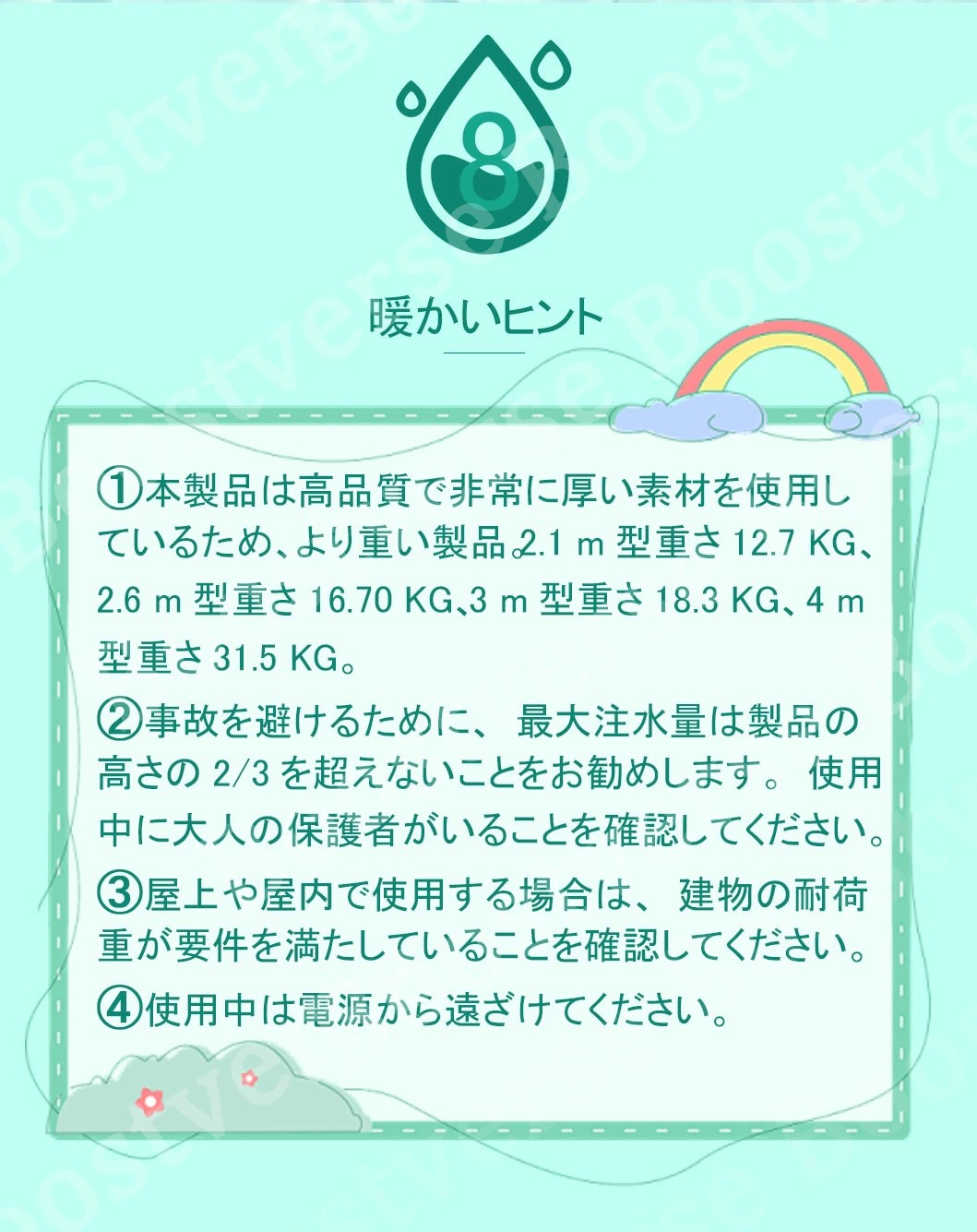 ※:プールの内側には対応する水位ラインが印刷されていますので、使用する際には水位ラインを超えないようにしてください。それを超えると、プールが耐えられなくなり、破損の原因となる可能性がありますので、ご注意ください。