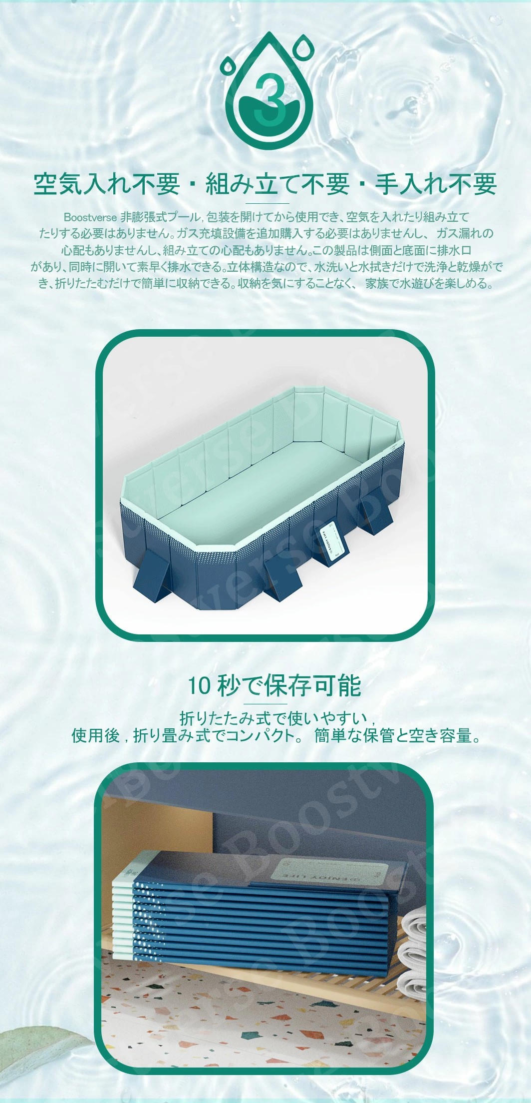 【使いやすさが魅力のプール】:折りたたみプール、組み立て不要、めんどな空気入れする必要がなく、穴が開いて萎んでしまう心配もございません!わざわざ高価な電動エアーポンプを購入する必要もない!屋外でも室内でも使える、暑い季節に大活躍!普段使わないときは、折りたたんでコンパクトに収納!
