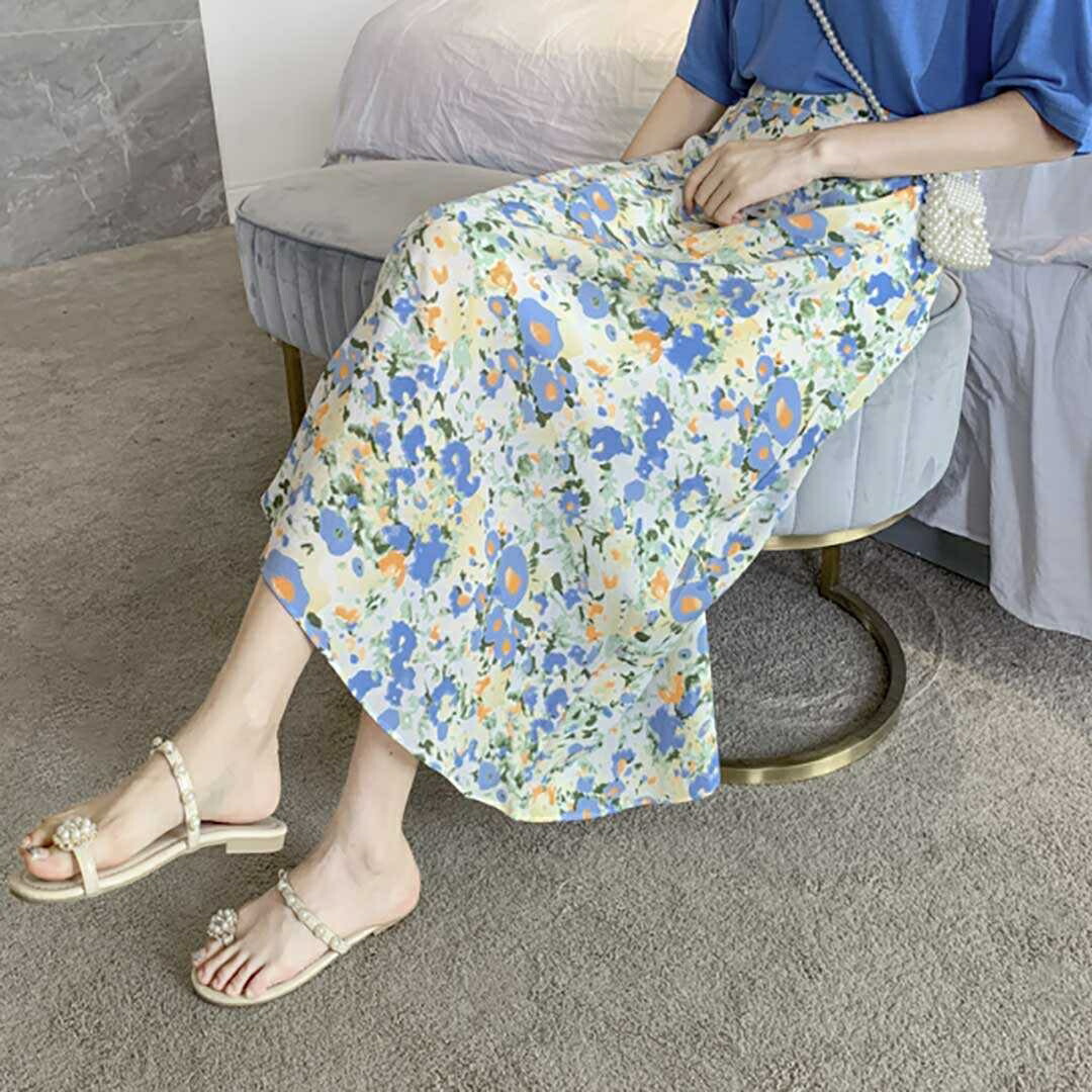 スカート 花柄ロング 青い花 韓国