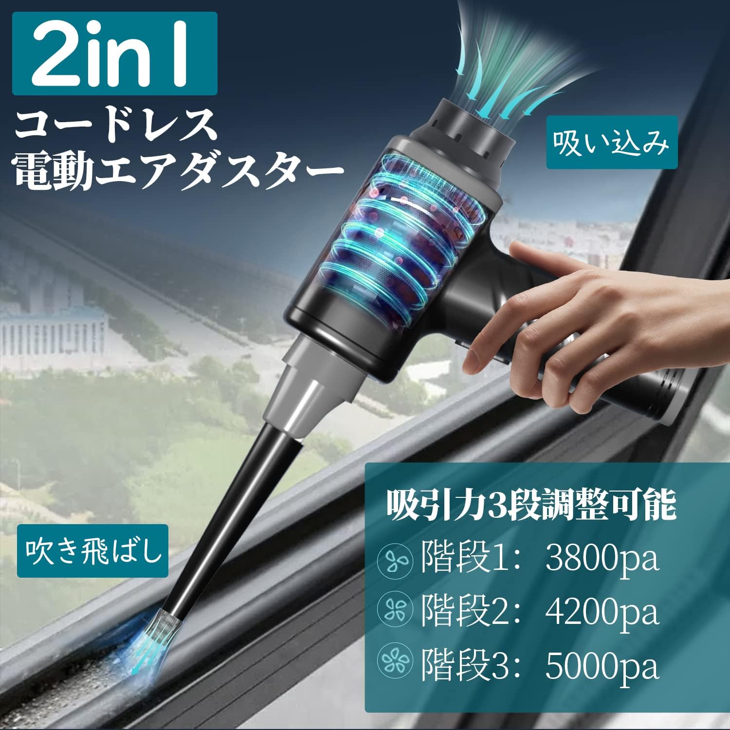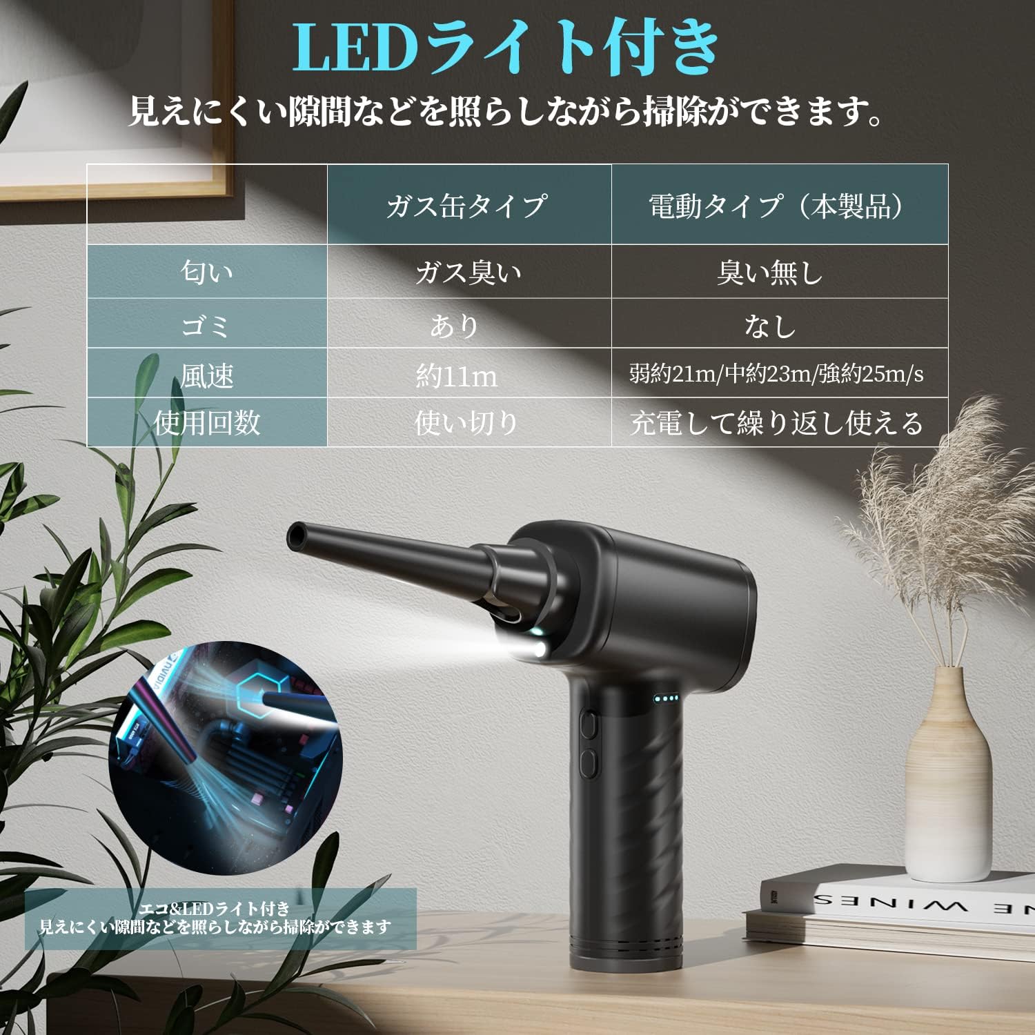 【逆さ使用OK&環境に優しい】電動エアダスターは逆さ噴射に対応、どんな角度でも自由に噴射が可能です。狭い場所や手の届きにくい場所でも、ゴミを吹き飛ばすことができます。ガス缶タイプのエアダスターに比べて繰り返し購入する必要がなく、ガスの匂い・空き缶の処理・火気による危険がありません、より環境にやさしいです。缶入り圧縮空気の代用品としては完璧です! 【幅広く活躍する】充電式でハイパワーエアダスター なので、キーボード掃除やパソコン掃除、家具掃除、車掃除などをする場合ができます。またエアコンや精密機械、窓のサッシ、フィルター、プリント回路基板、ドアの敷居など、あらゆる場所で使用できます。