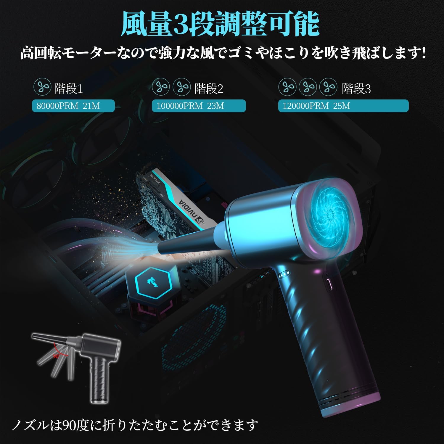 【3段階風量調整&操作簡単】エアダスターの電源ボタンで3つの風速モードを簡単に切り替えられます。掃除する場所や物によって使い分けができます。電源ボタンを1.5秒長押すと、電源ON/OFFが切り替わります。電源ボタンを1回押すごとに、弱風(80000RPM)→中風(100000RPM)→強風(120000RPM)の順に切替わります。点滅スピードによって段階を表示するグリーンライトも搭載しています。一度ボタンを押しれば、連続噴射できます。噴射し続けても勢いが衰えない電動エアーダスターです。電源ボタンと速度調整ボタンが一体化され、片手だけで全ての操作ができます。詳しい日本語説明書が付いて、理解やすくて、より簡単に操作できます。小型で軽量なので、長時間に使っても疲れにくいです。持ち運びや収納にも便利な形状です。