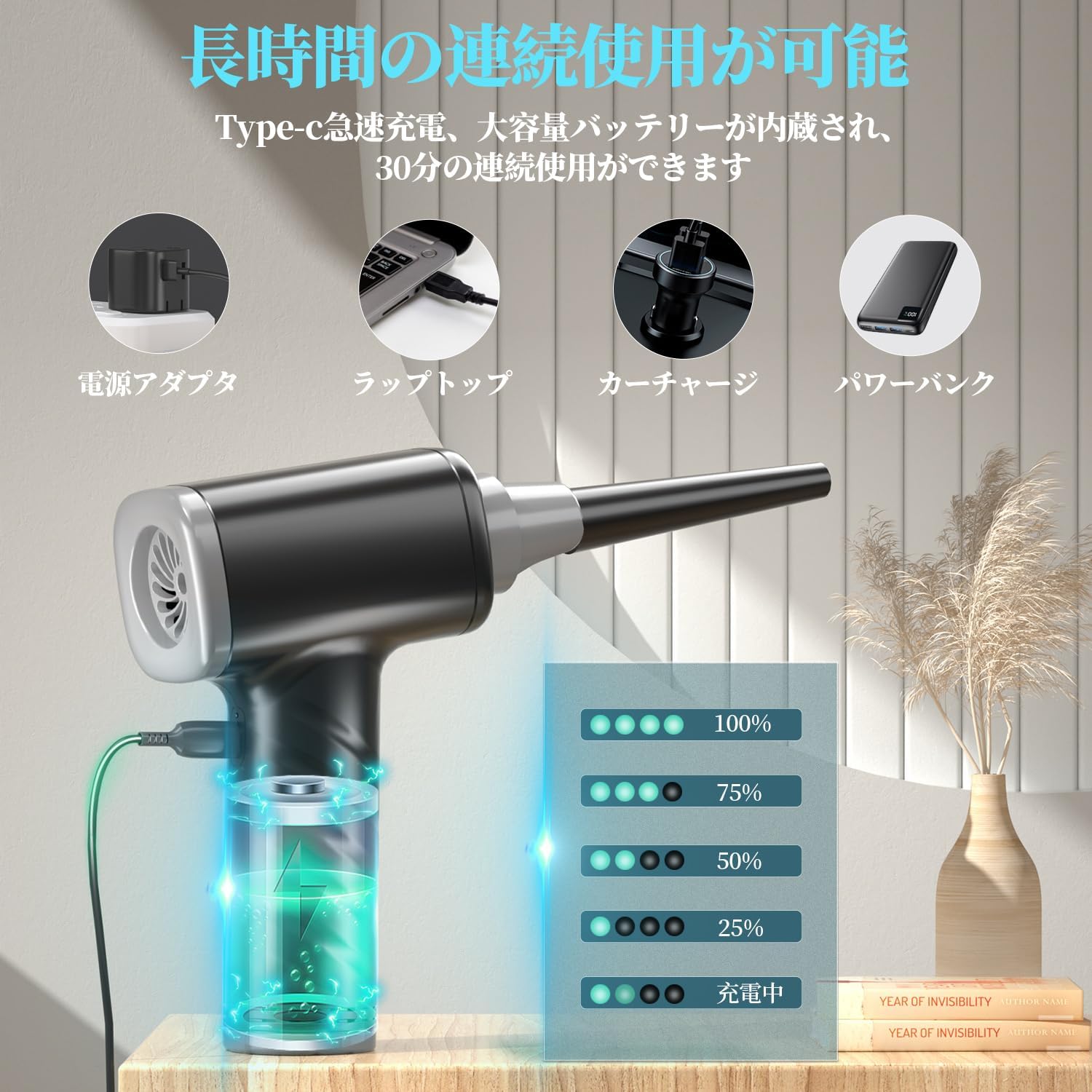【内蔵6000mAh大容量バッテリー&Type-C充電】充電式で繰り返し使える電動エアダスターです。6000mAh大容量バッテリーが内蔵され、約2.5時間のフル充電で30分連続使用が出来ます。モード1の作業時間は約30分、モード2の作業時間は約20分、モード3の作業時間は約15分です。電池残量がすぐに確認できるLEDを搭載しています。コードレスなので、どこに行っても電源の問題を心配なく、持ち運びに便利。Type-C急速充電で、パソコンやモバイルバッテリーからも充電可能、とても便利です。