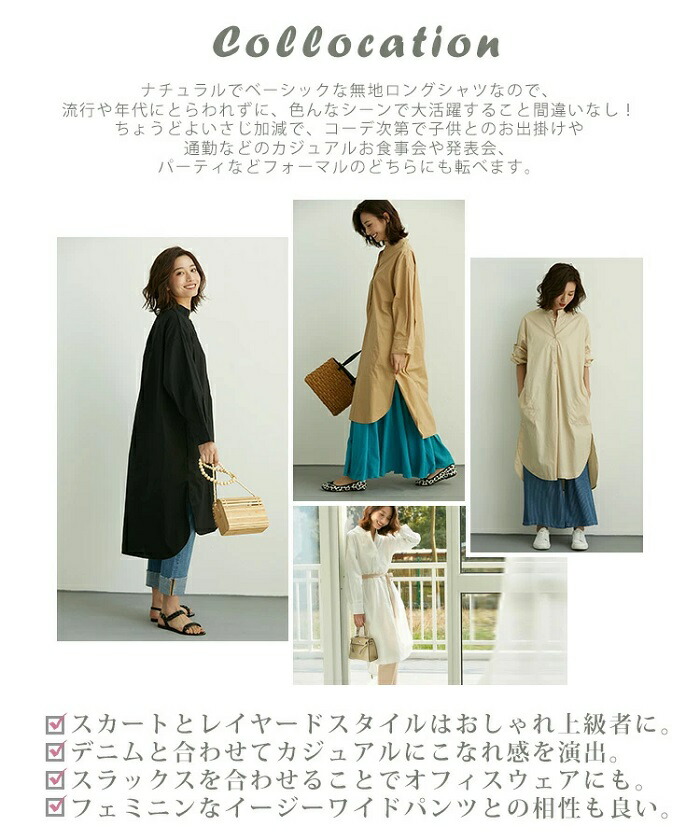 【日常に出番が多い】流行や年代にとらわれない、ナチュラルでベーシックな白無地ロングシャツなので、コーディネートによりいろんなシーンに着まわしが叶えます。子供とのお出掛けや通勤などのカジュアルも、ちょっとしたお食事会やパーティなどのフォーマルも登場できるアイテム間違いなし