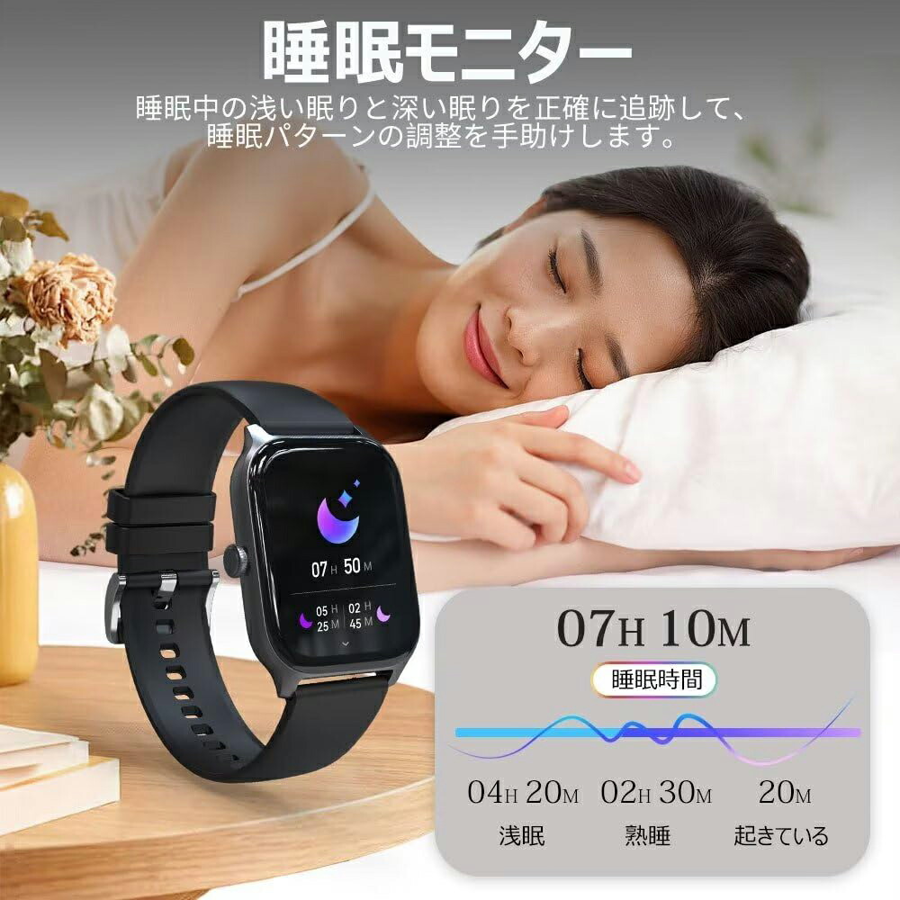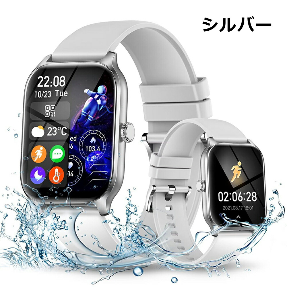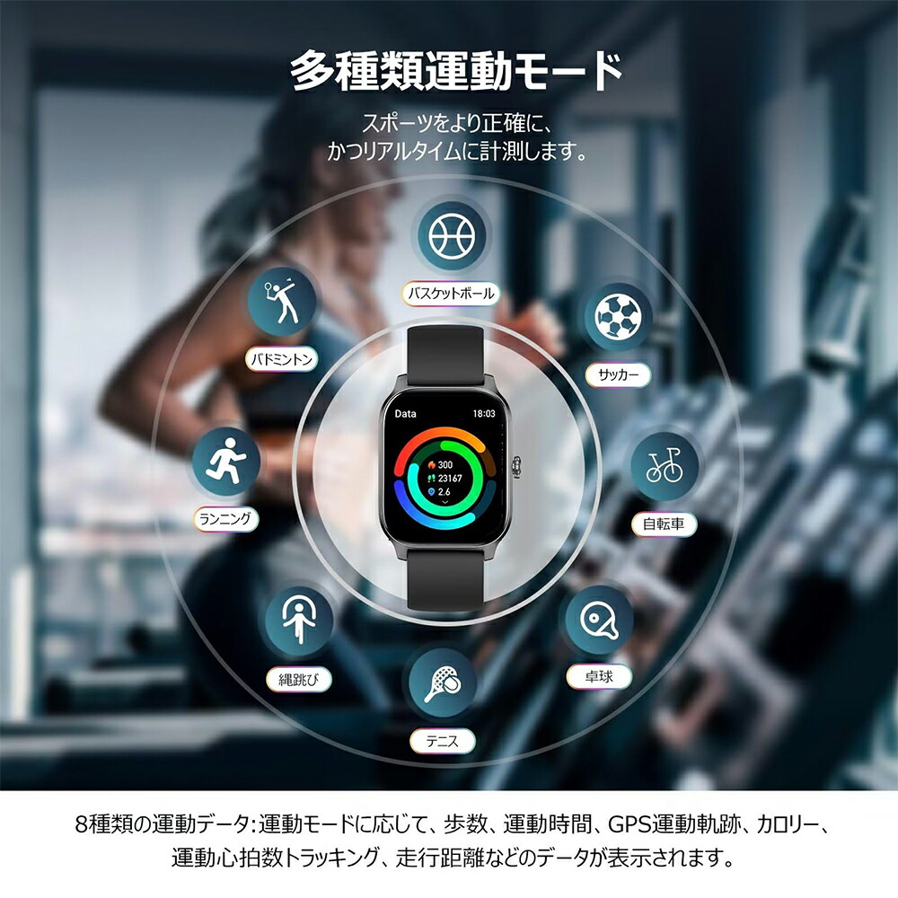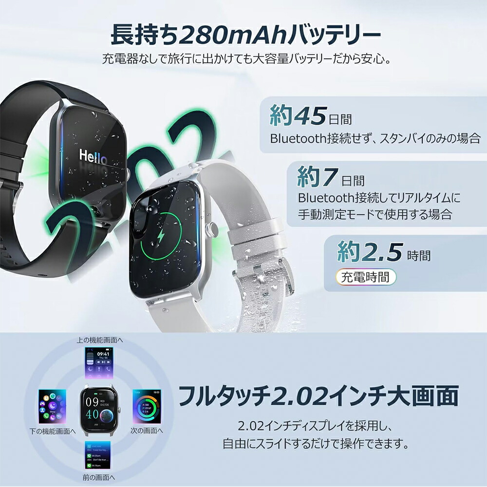 【安心のIP68防水&耐久バッテリー&100多種類な運動モード】超安心のIP68防水仕様です!日常の手洗いや洗顔の際は取り外すの必要はなく、天気が荒れている日も、心配は不要です。長持ち280mAhバッテリーを採用しているので、充電ケーブルなしで旅行に出かけても大容量バッテリーだから安心です。2.5時間の充電で、約7日間の使用時間と45日間の待機時間を提供します。手首につけるだけで、歩数、距離などのデータを確認することができる活動量計機能搭載しています。運動状態を可視化することによって、運動への意欲を高め、運動不足解消をスマートにサポート!スマートウォッチには100以上の運動モードがあります。例えば、バスケットボール、サッカー、自転車、卓球、テニス、縄跳び、ランニング、ヨガ、ウォーキング、バドミントンなど。スポーツをより正確に、かつリアルタイムに計測します。