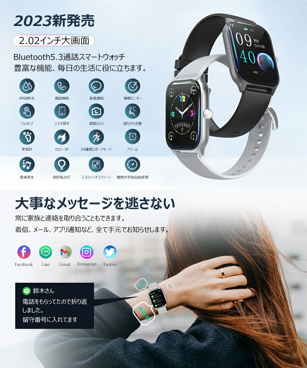 赤字覚悟 実質2016円 スマートウォッチ レディース メンズ Bluetooth5.3 2.02インチ大画面 Smart Watch 多機能 通話機能 着信 メッセージ通知 IP68防水 文字盤カス