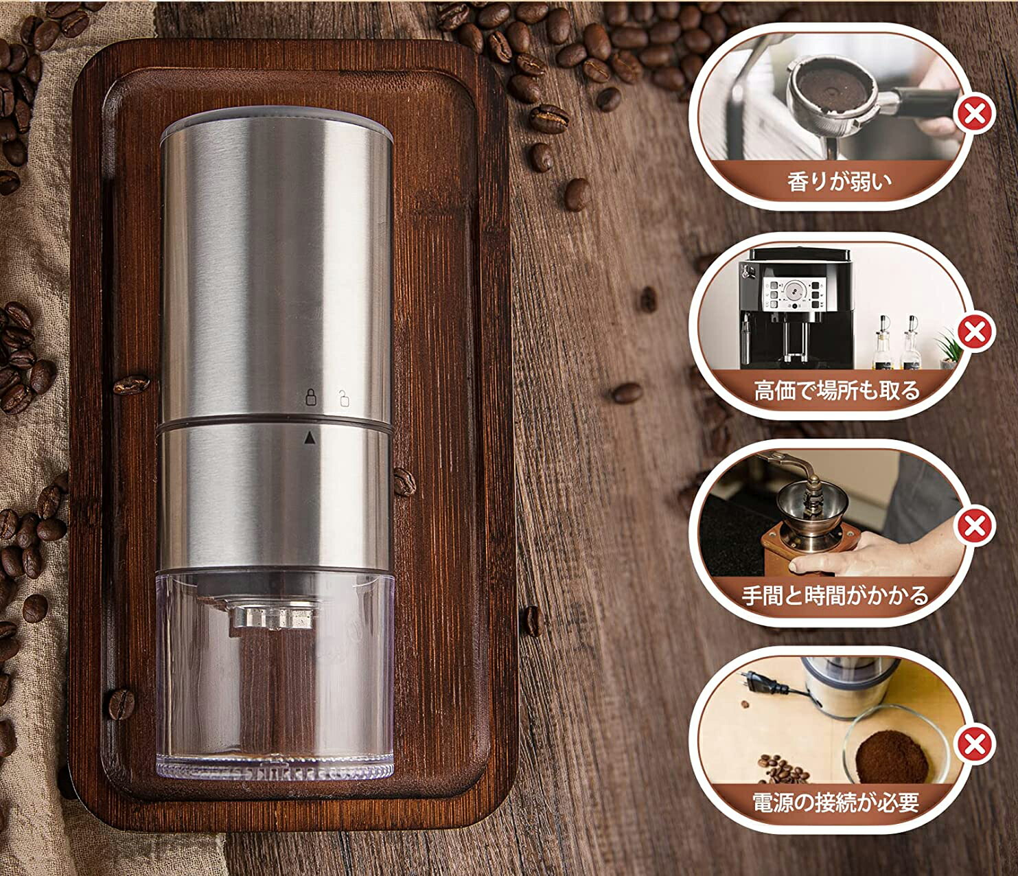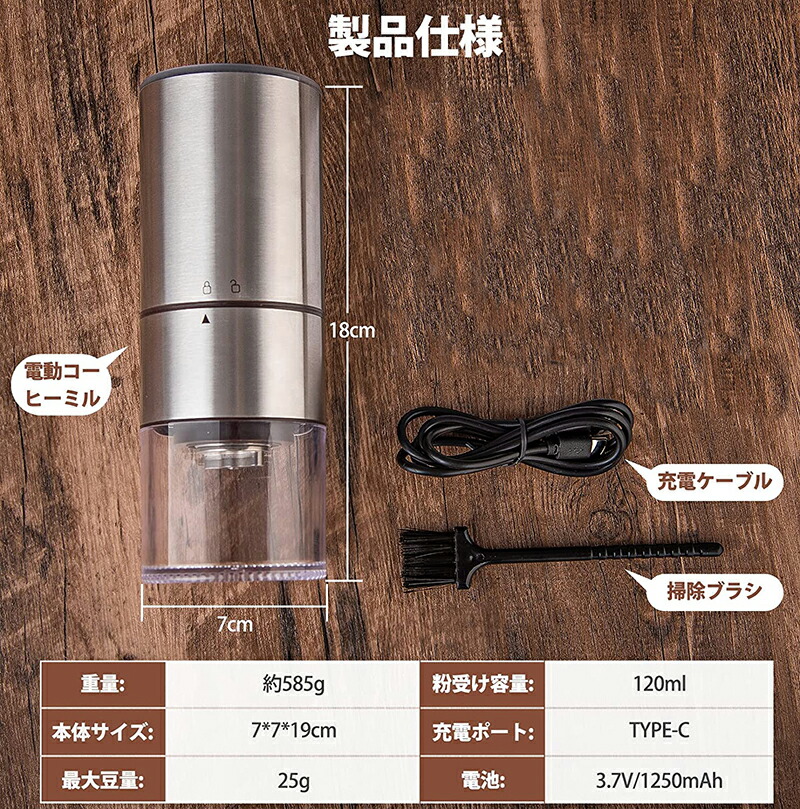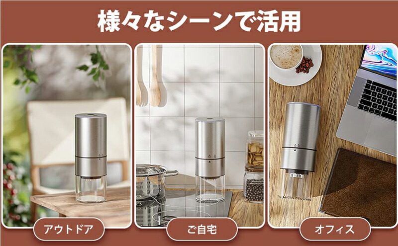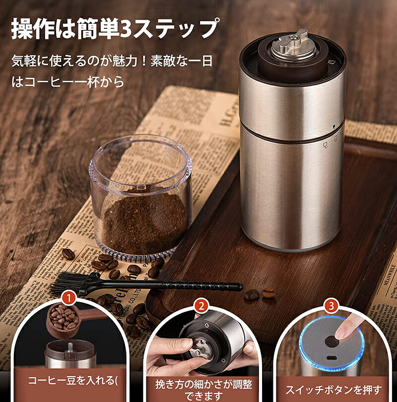 ◆最新版充電式コーヒーミルは独自設計のステンレス鋼コニカル刃と高級感を溢れてるステンレス本体で摩耗しにくい、また錆びることがないので安心して末永くお使いいただけます。市販の電気式コーヒーミルは高速粉砕タイプで、コーヒー粉末が酸化しやすい。当社の電動コーヒーミルはスロー研磨タイプ、昔ながらの臼型方式を採用しているため、粉末をより均一にし、熱も発生しにくくし、手挽きのようにコーヒー本来の香りを最大限に保つことができます。いつでも新鮮なカフェを味わい、コーヒーとの時間をじっくり楽しみたい人にはおすすめです。