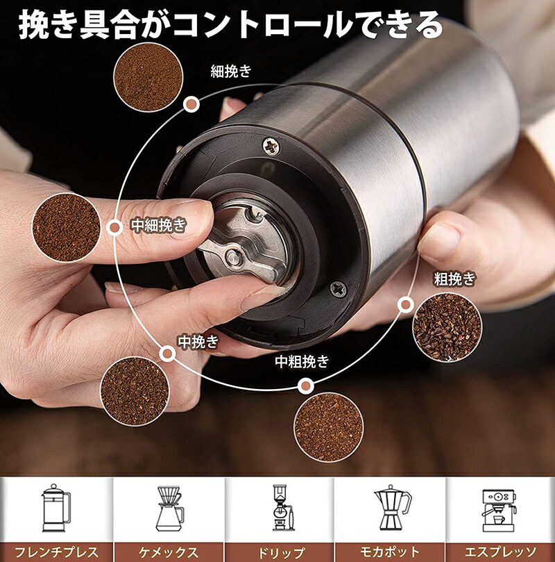 ◆電動コーヒーミルの粗さ調節ダイヤルを回す事で挽き具合を無段階調整可能、極細挽き、細挽き、中細挽き、中挽き、粗挽き(時計回りに回すと細挽き、逆時計回りに回すと粗挽き)お好みの粗さに調整できます。電動ミルの粉末カップは落下しにくいねじ込み式に改良されています。しかも透明なので、コーヒー豆の粗さを簡単にチェックできます。エスプレッソマシン、モカエキスプレス、サイフォン、ペーパードリッパー、フレンチプレス、ウォータードリッパー、電動ドリップポットなど様々なコーヒーを楽しめます。
