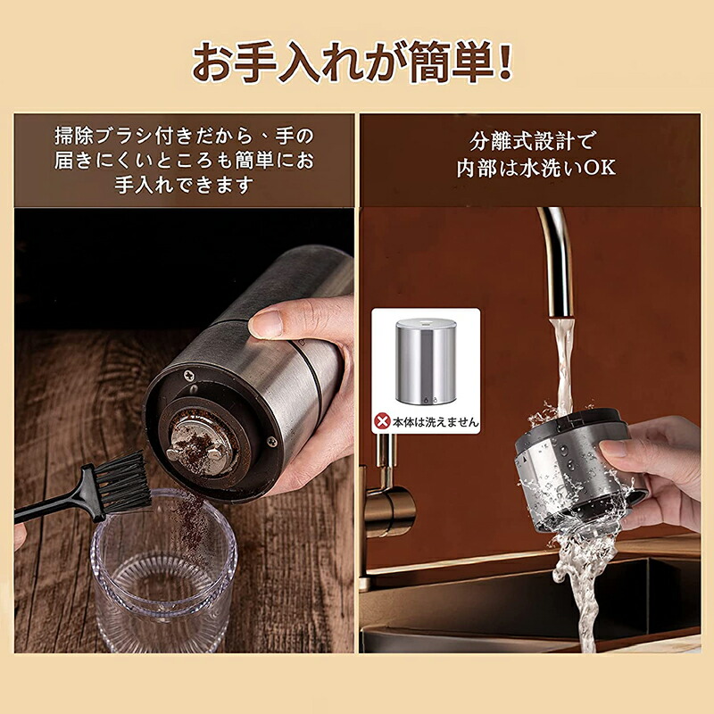 ◆電動ミルはボタン一つでミル刃を動かして自動で豆を挽くタイプです。押し続ける必要がなく、過負荷防止装置を搭載しています。感知センサーによりコーヒー豆を挽き終わったら自動的に電源をOFF。両手が解放されても美味しいコーヒーを飲めます。コーヒーミルの各パーツは分解して丸洗い可能。ついてる粉末を付属のブラシで軽く掃除すると、早くて簡単に取り除けます。お手入れが非常に楽です。