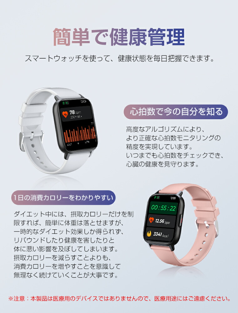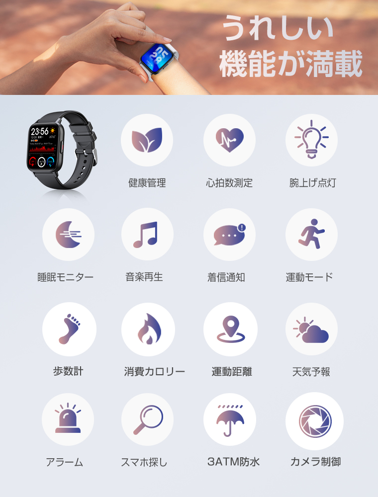 3ATM防水機能も付いているので、雨の日でも濡れてしまうのを気にせず使え、日常生活の防水ニーズに満足できます。このスマートウォッチは3ATM防水レベルに準拠しているため、30メートルの静水圧で10分間耐えることができますが、実際に水深30メートルの水中における防水性を保証するものではありません。