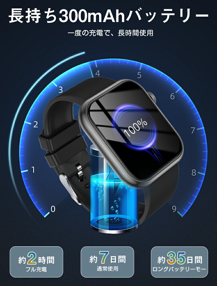 素材・PC+ABSスクリーン・1.96インチ防水レベル・IP67対応手首径・150-225mm対応OS・iOS9.0、 Android4.4以降充電時間・約2時間Bluetooth・Bluetooth5.2セット内容・スマートウォッチ(本体)x 1