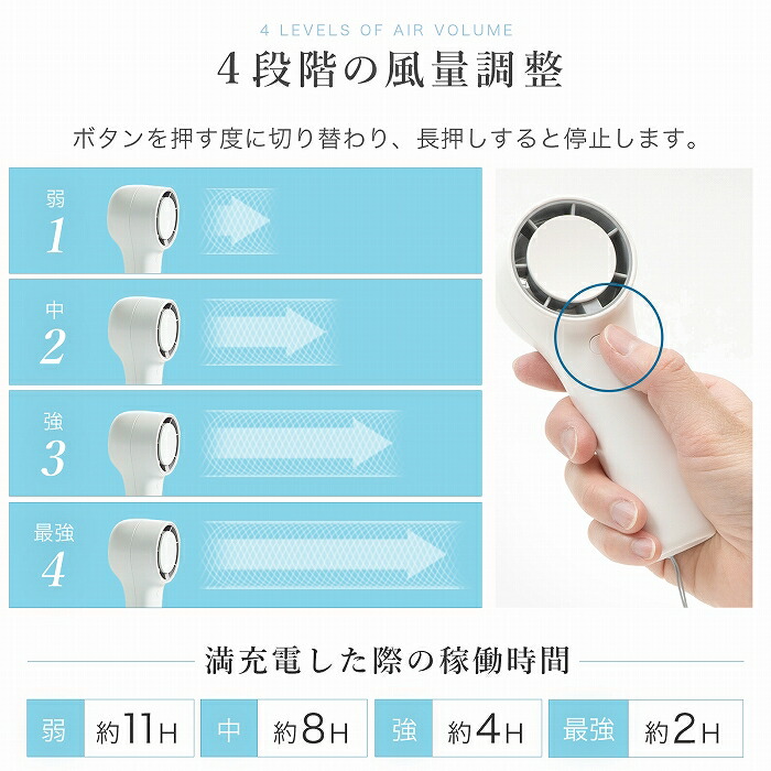 ・ワンボタン手持ち扇風機なので、ワンタッチで風量を4段階に切り替えて使用できます。