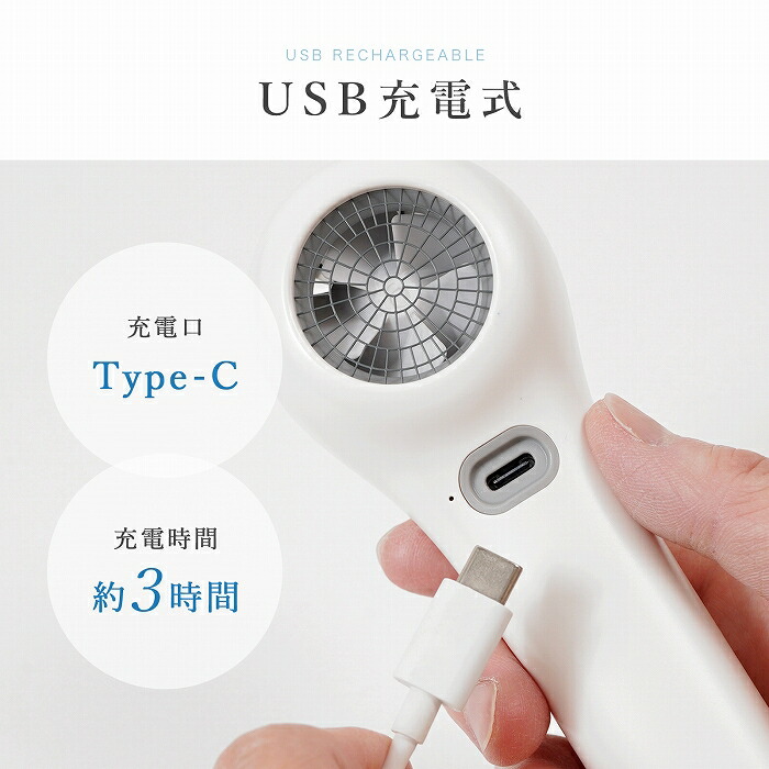 ・付属のUSBケーブルを、パソコンやモバイルバッテリー、コンセントに繋げば、約3時間で満充電できます。セット内容 扇風機、USBケーブル( Type-C )、ストラップ、取扱説明書様々な暑さ対策に バーベキューやキャンプ、野外フェスなどのアウトドアイベント、スポーツ観戦やテーマパーク、通勤通学後のクールダウン、熱がこもりやすいキッチンでの調理や家事の時など、屋外・屋内を問わず使用でき、熱中症対策にも役立ちます。保証期間 3ヶ月間