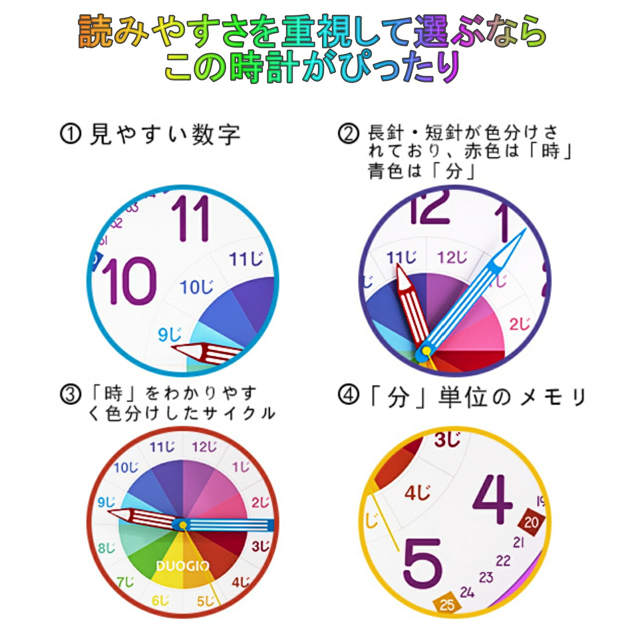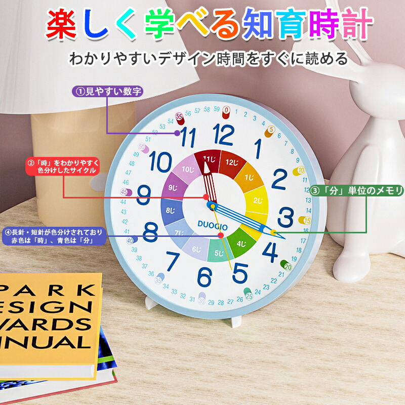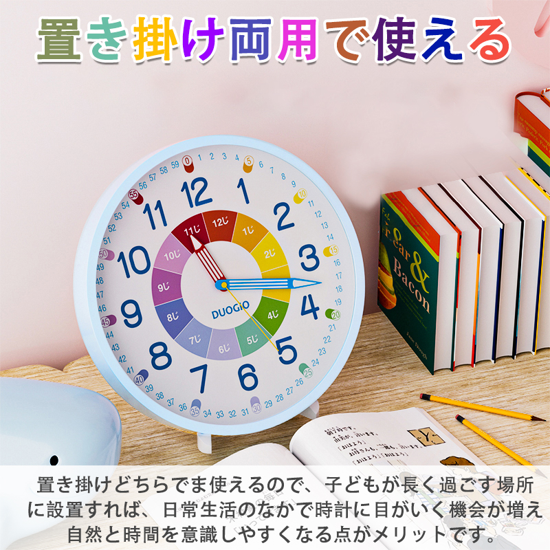 DUOGIO カラーで分かりやすい 知育時計 置き掛け両用時計 12寸 12インチ スタンド付き Time リビング学習 壁掛け時計 おしゃれ クロック プレゼント 置時計