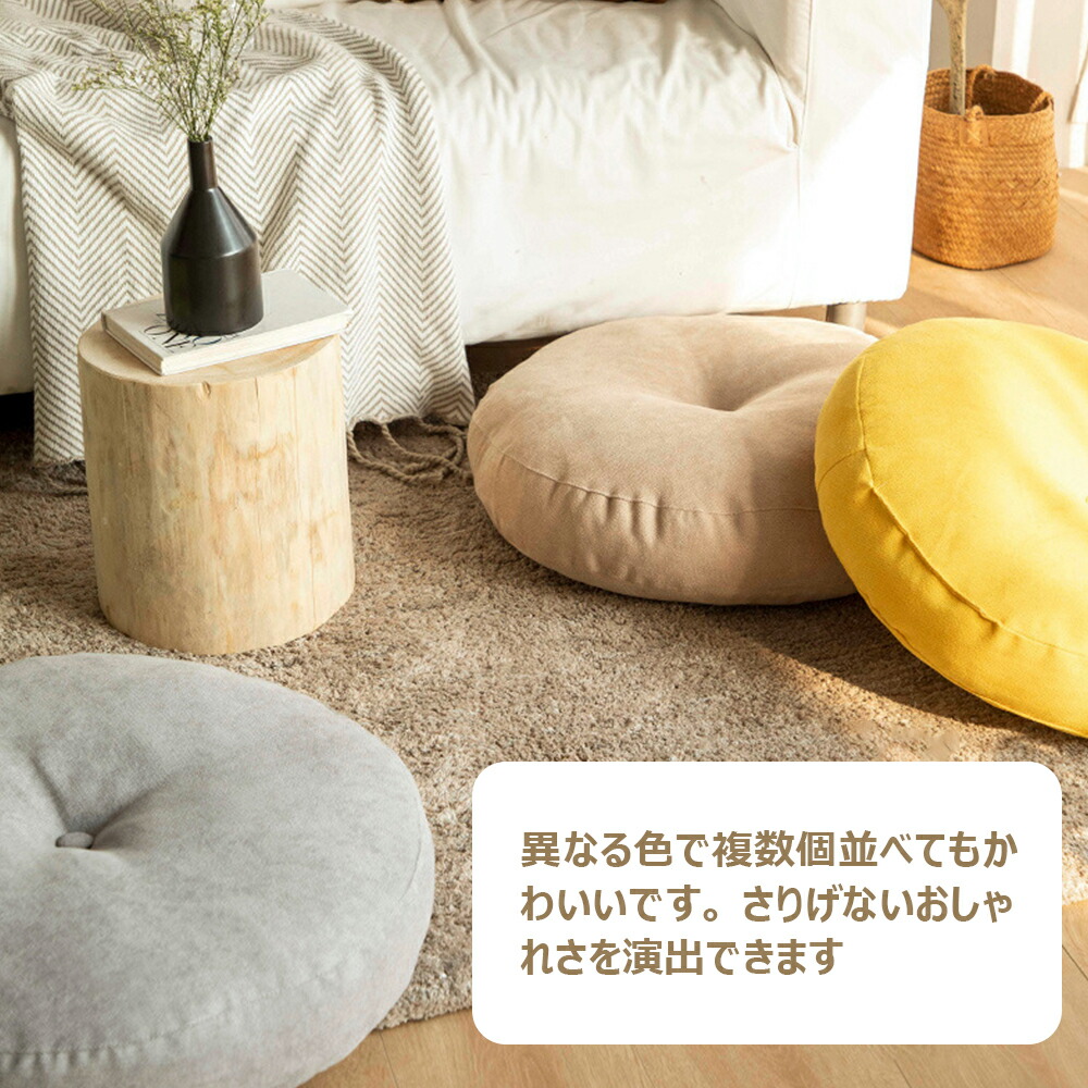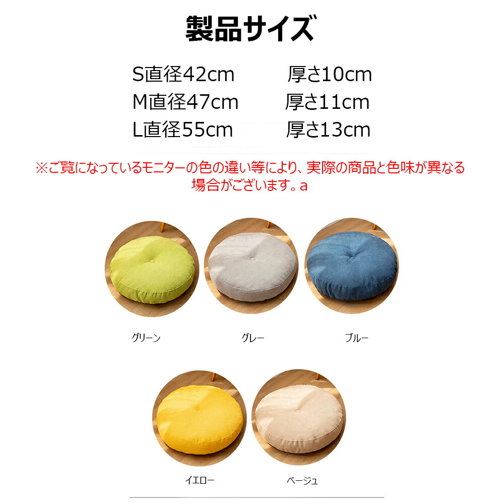 L直径55cm厚さ13cm(重量1050g)素材綿麻混紡カラーイエロー、グリーン、ブルー、グレー、ベージュ備考●サイズ詳細等の測り方はスタッフ間で統一、徹底はしておりますが、実寸は商品によって若干の誤差(1cm~3cm )がある場合がございますので、予めご了承ください。