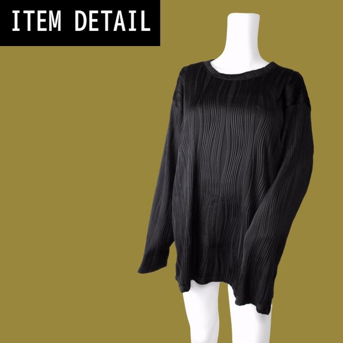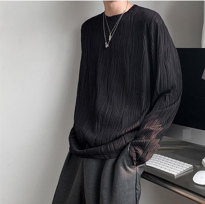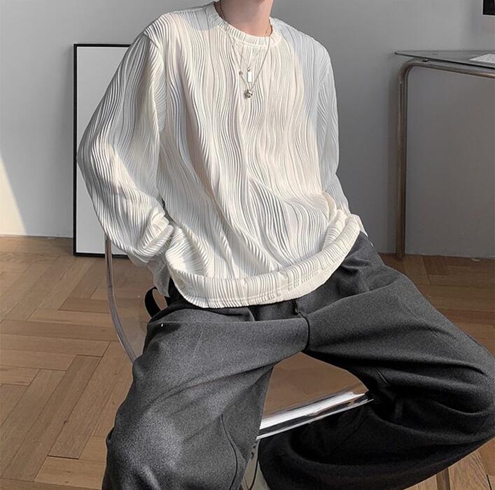 プリーツデザインが際立つこのメンズトップスは、シンプルながらも洗練された印象を与えます。