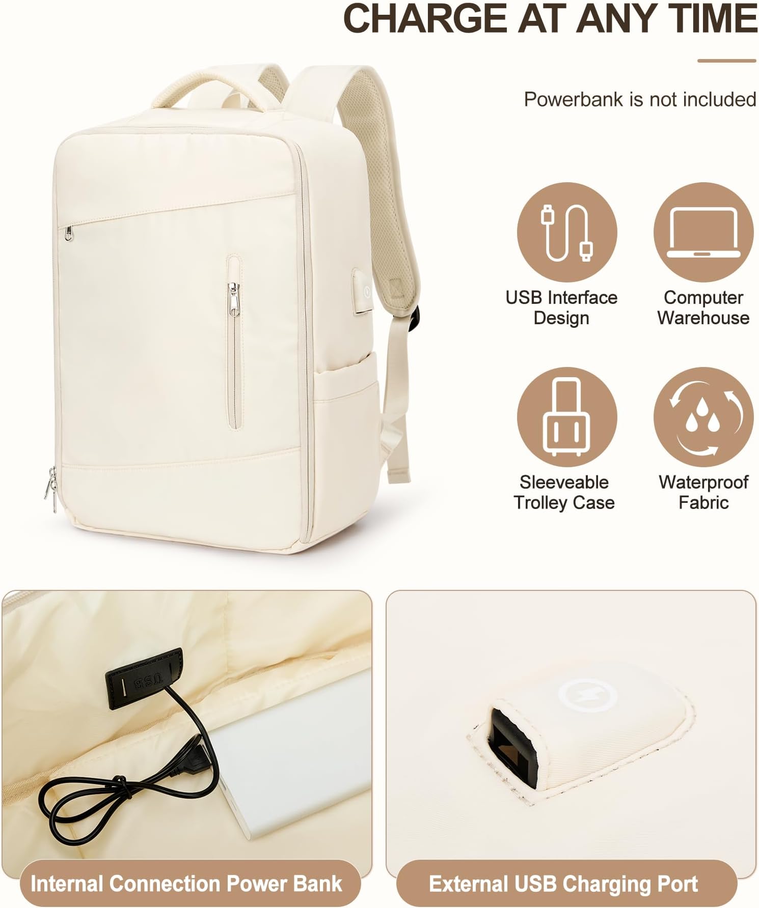 livbote キャリーオンバックパック レディース メンズ 15.6インチ ラップトップ トラベルバックパック USB充電ポート付き 防水 パーソナルアイテム バックパック フライト カジュアル デイパック バックパック 大学勤務用 ベージュ