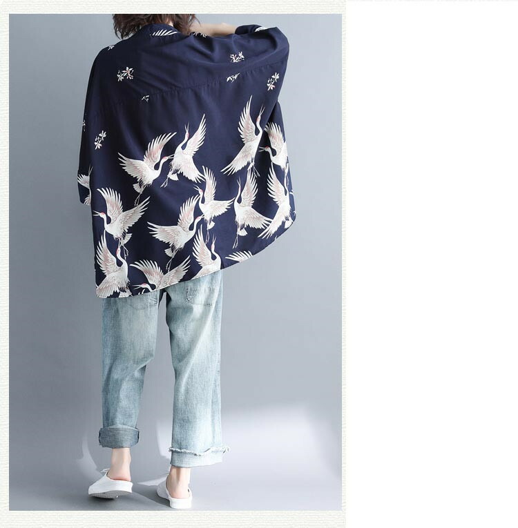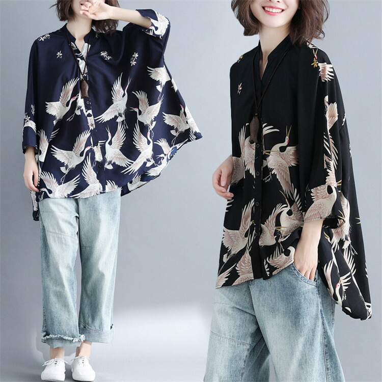 アロハシャツ 七分袖 レディース トップス シャツ シャツブラウス 7分袖 長袖 ビッグサイズ オーバーサイズ 和柄 鶴柄 スキッパーブラウス 羽織 春夏
