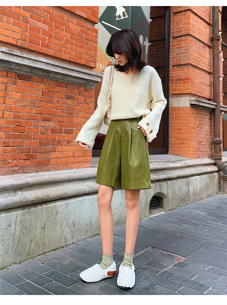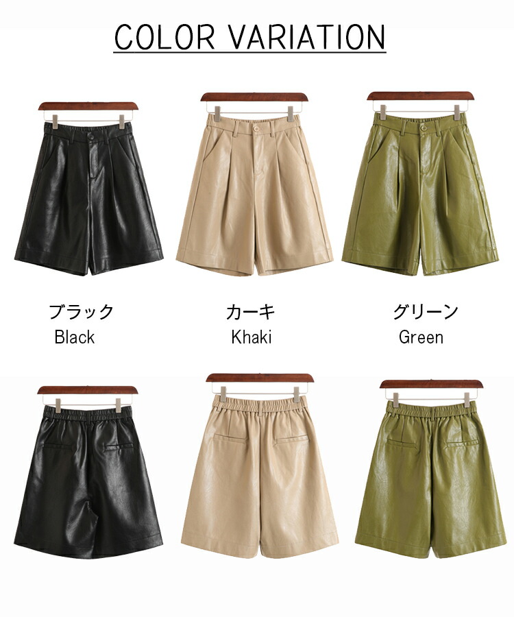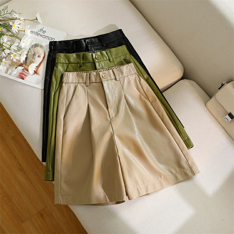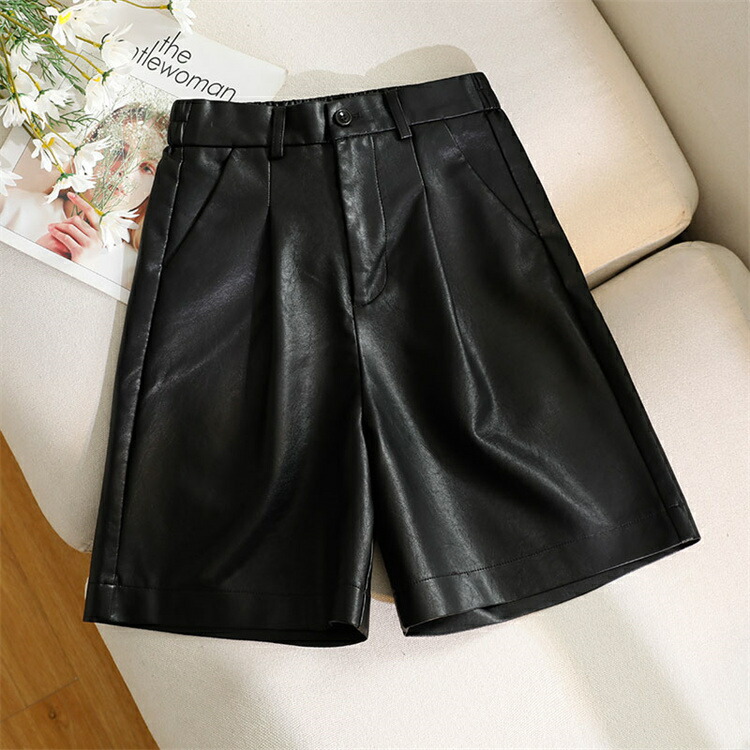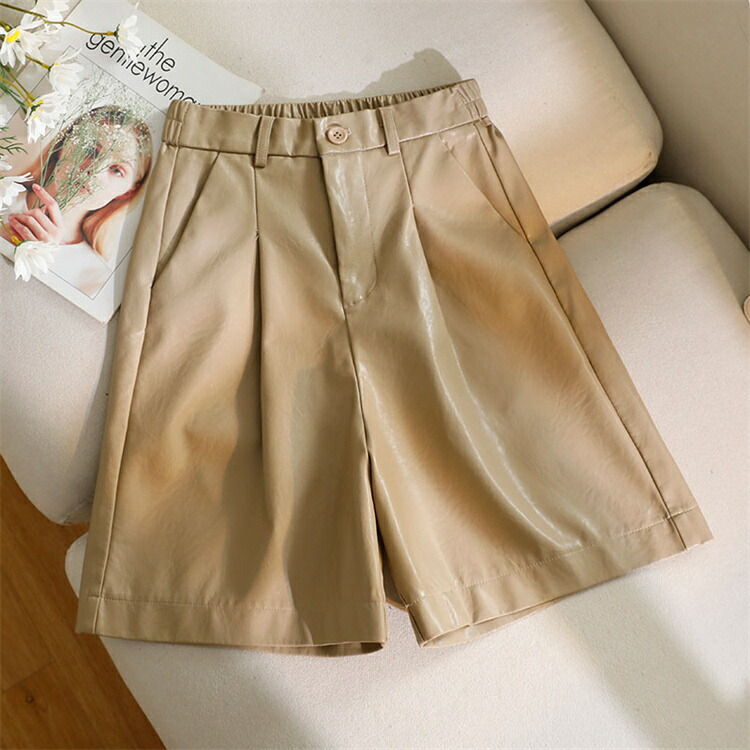 フェイクレザーハーフパンツパンツ レディース ボトムス ズボン ハーフパンツ ショートパンツ ウエストゴム ゆったり 秋冬 レザーショートパンツ