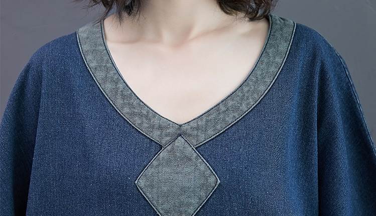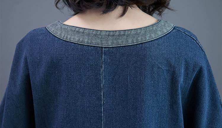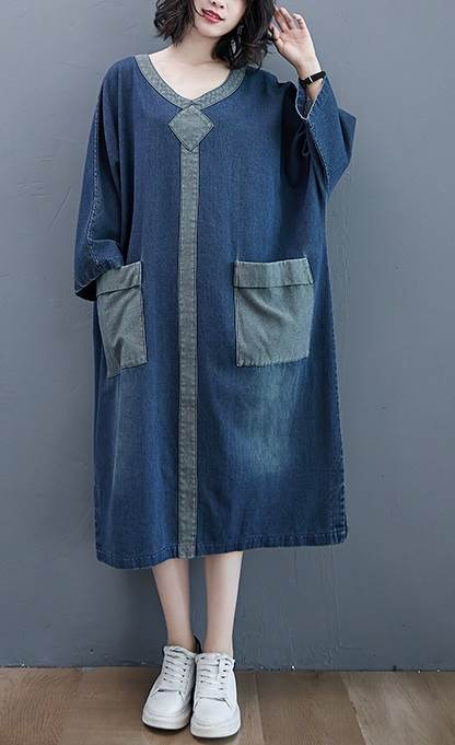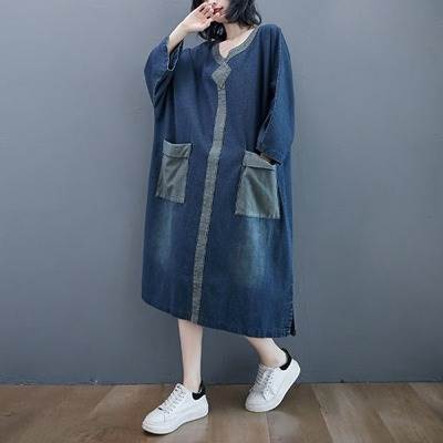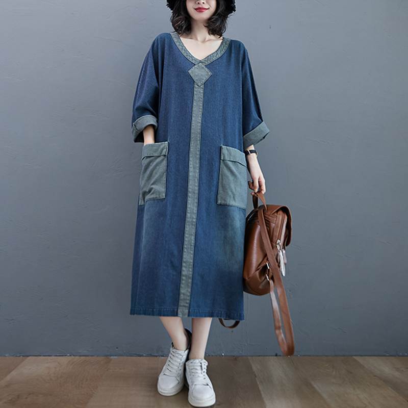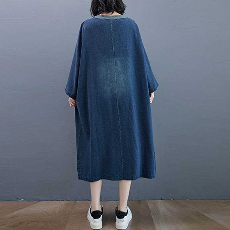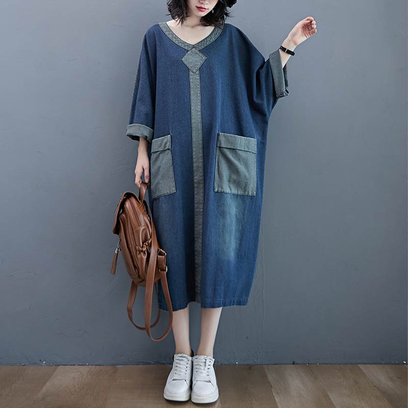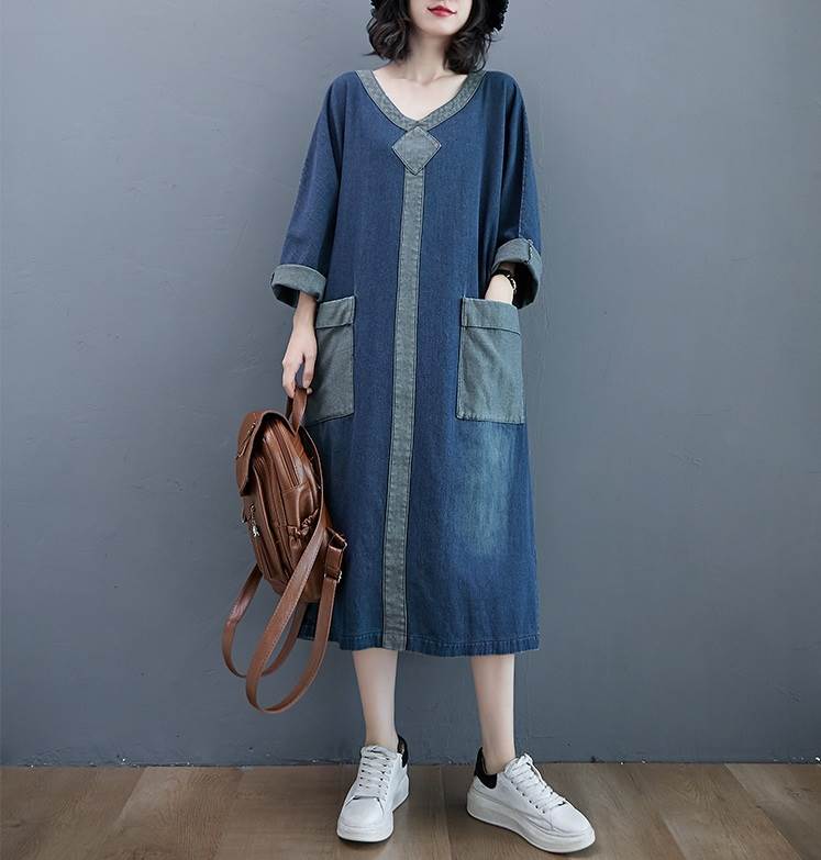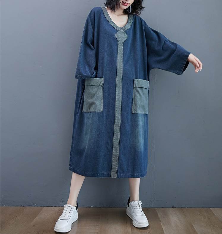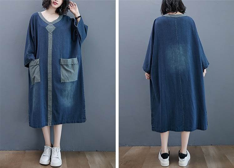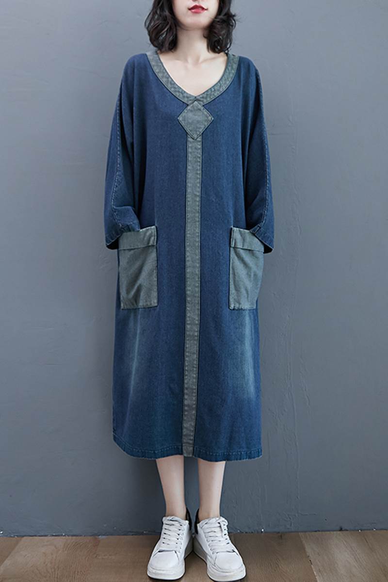 ワンピース ロング ゆったり ルーズ デニム 厚い ミモレ丈 Vネック 長袖 袖あり ポケット付き ウォッシュドデニム シンプル コントラスト 配色 ドルマンスリーブ バットスリーブ 大きめ 体型カバー お洒落 おしゃれ ママ マタニティ 通勤 お出かけ デート 旅行 休日 レディース 30代 40代 春 夏 秋 大きいサイズ M L XL 2XL ブルー 青