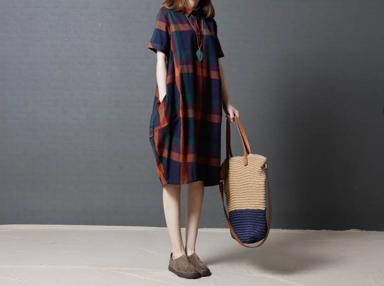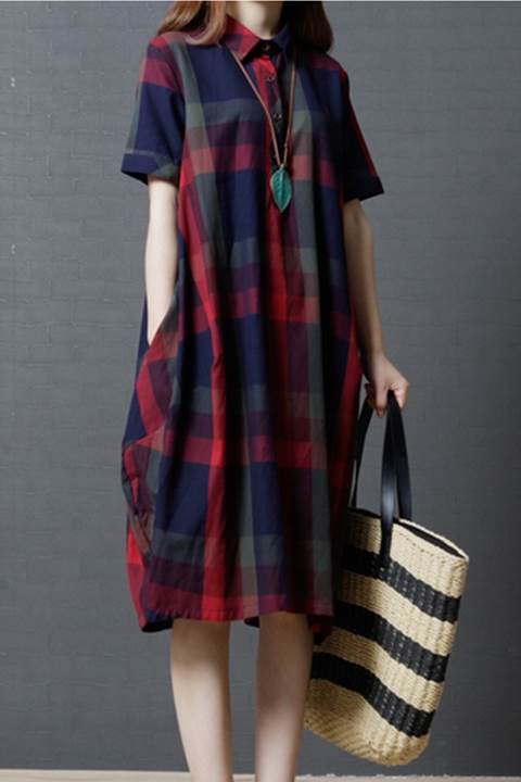 ワンピース レディース レトロ チェック柄 綿 コットン 半袖 ゆったり ルーズ ゆる ポケット付き 体型カバー ひざ下 ミディ丈 襟付き ポロ襟 フロントボタン 薄い 清楚 おしゃれ 通勤