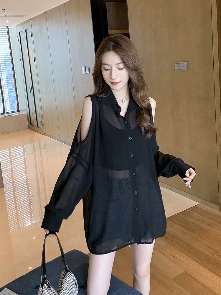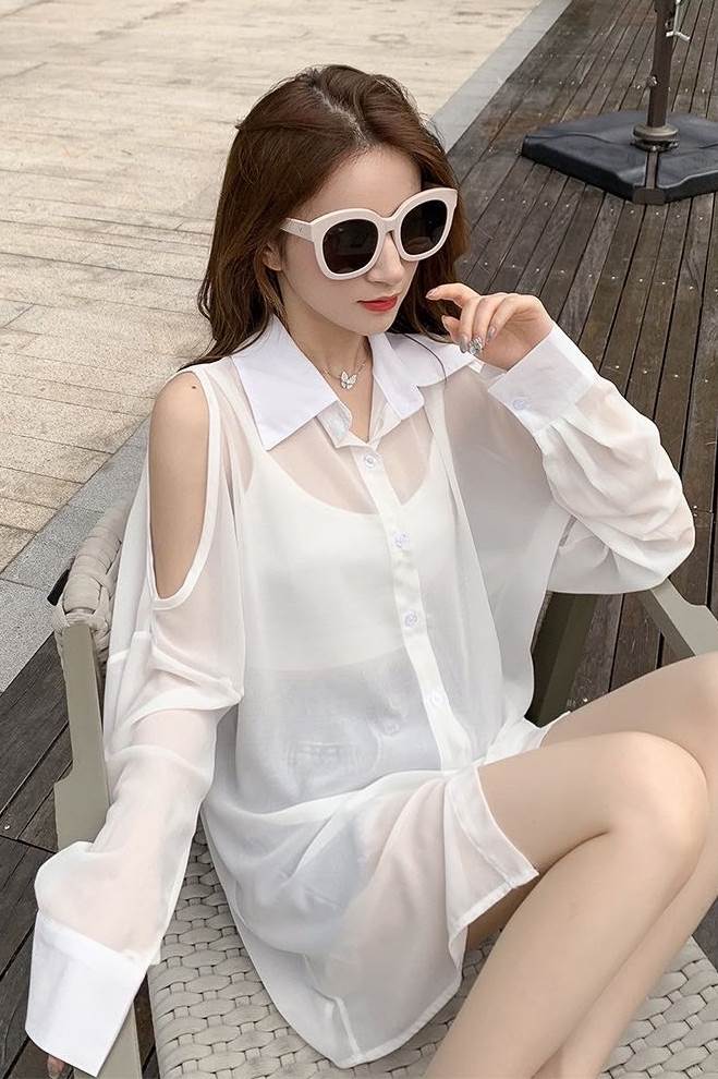 オフショル 長袖 シースルー シャツ トップス 白シャツ 白トップス ミディアム丈 袖あり オフショルダー 襟付き シフォン 前開き 透け感 薄手 かわいい 大人可愛い きれいめ シンプル カジュアル 大人 おしゃれ お洒落 大人女子 こなれ感 ルーズ 個性的 無地 春 秋 10代 20代 レディース 通勤 学生 通学 デート お出かけ 女子会 休日 旅行 着回し 普段使い 重ね着 韓国 オルチャン 穴あき ゆったり 大きいサイズ M L XL 2XL 3XL 4XL 色展開 白 ホワイト 黒 ブラック