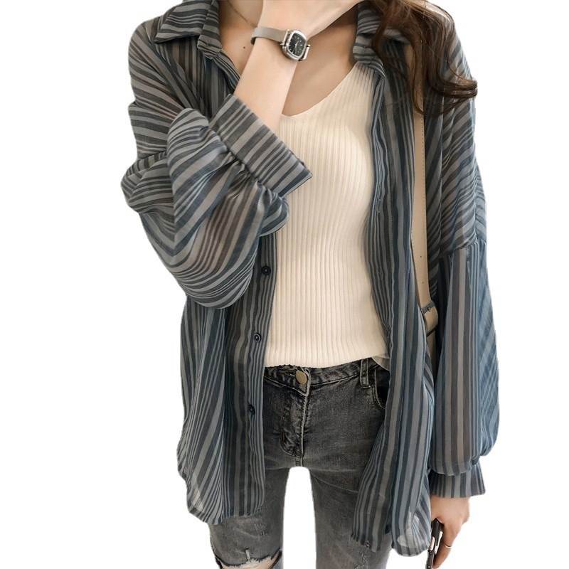 トップス レディース シャツ ブラウス 長袖 襟付き シフォン ストライプ 透け感 シースルー かわいい おしゃれ 大人 女子 こなれ感 ラフ キュート ルーズ カジュアル