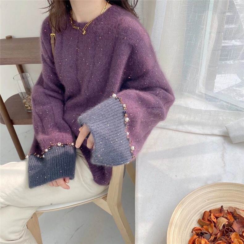 ラメ感で大人可愛い魅力を引き立てるニット。バイカラーデザインが、都会的で上品な雰囲気を演出します。オーバーサイズのシルエットは、きれいめからガーリーまで、あなたの個性を引き立てます。トレンド感と着回しの自由さを兼ね備えた、モテ度抜群のアイテムです。紫とグレーのパールがキラキラ輝き、インスタ映えも叶えます。自信を持ってロマンティックなスタイルを楽しんでください。