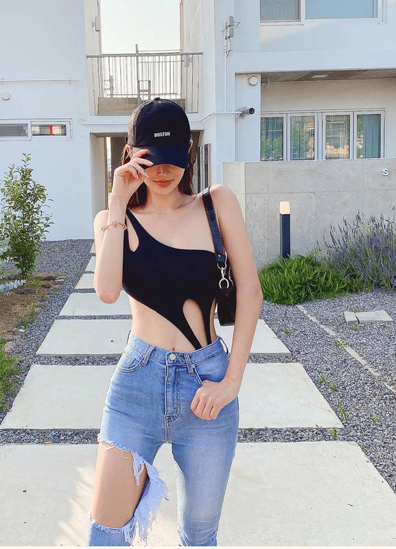 カットアウトしたワンショルダーワンピース。