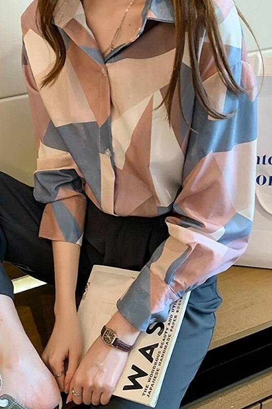 ブラウス シャツ トップス レディース 個性的 長袖 春 柄 ピンク ブルー 2色展開 襟付き フロントボタン 前開き 休日 お出かけコーデ 普段使い 通勤 着回し ファッシ