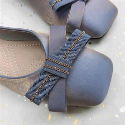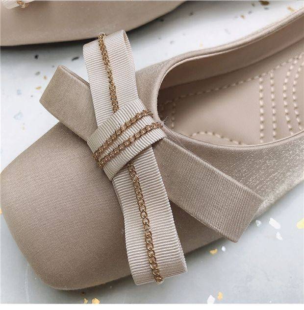 大きめのリボンにゴールドラインが入ることで、より華やかな一足に仕上がっています。かかとはペタンコなので歩きやすいパンプスです。