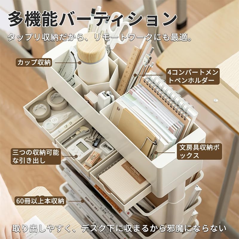 ファイルワゴンは5段で約60冊の本を収納でき、教科書、補習書、資料、興味書、問題用紙なども分類できます。
