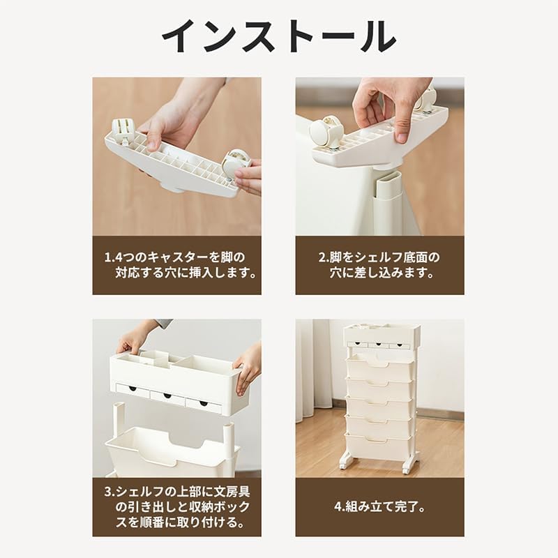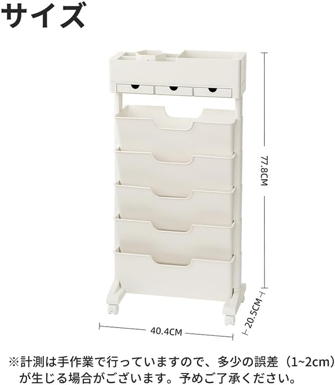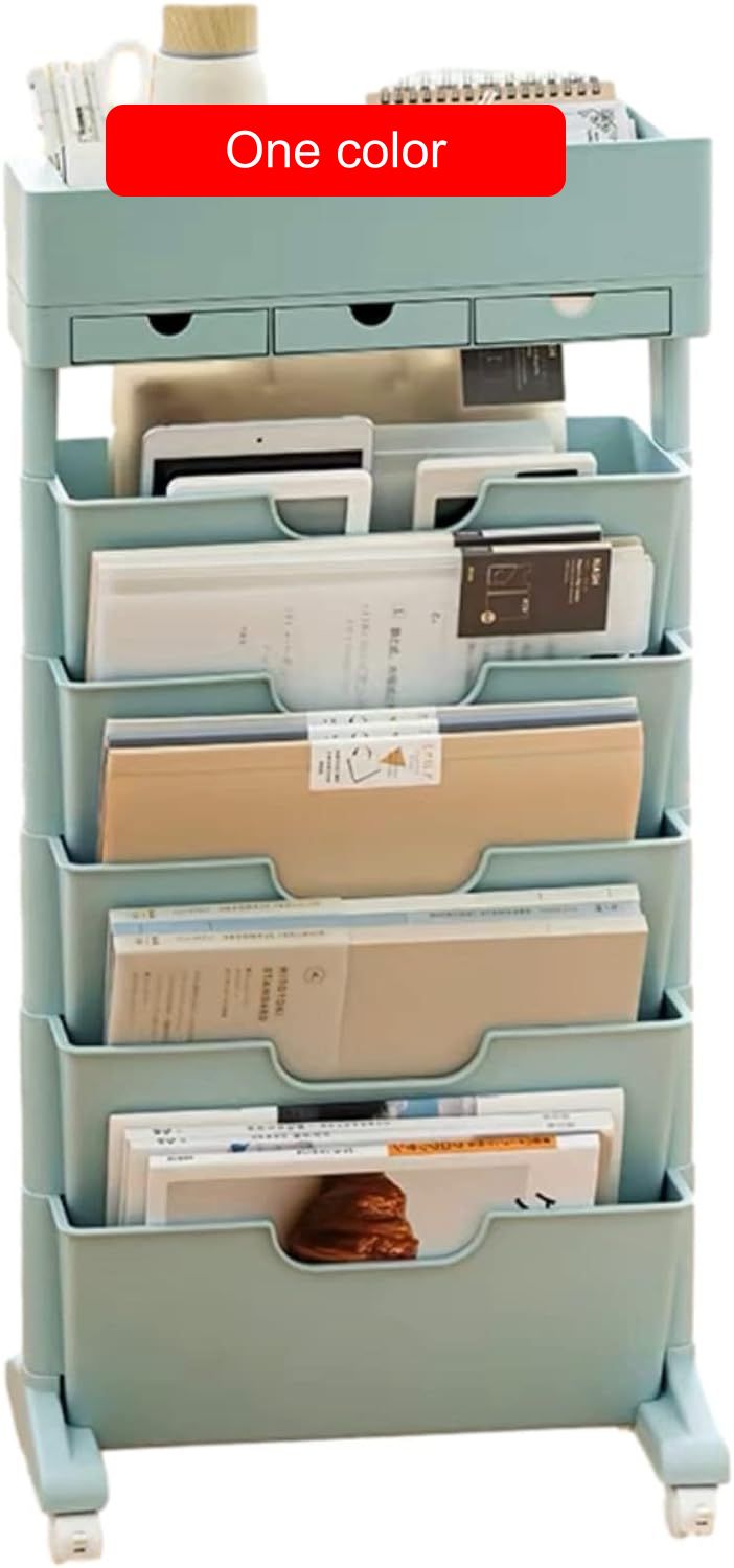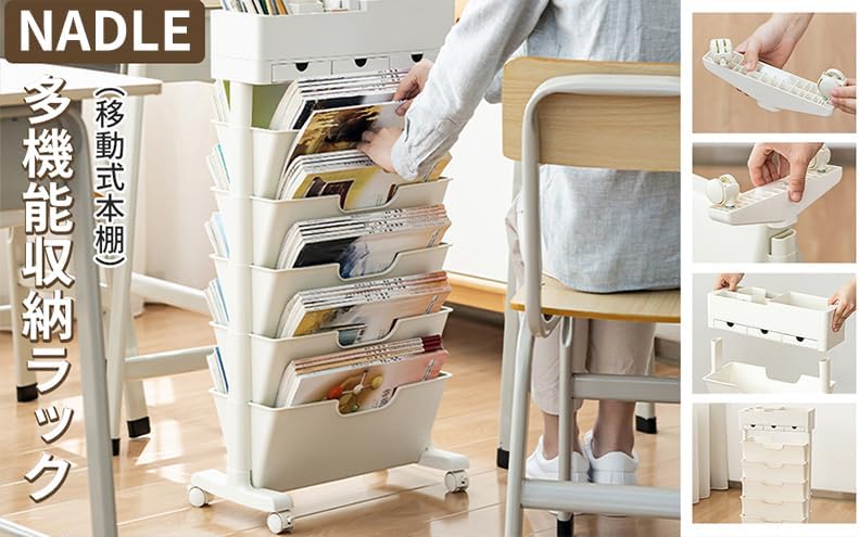 【充実した機能デザイン】本棚は大容量で、上段には雑貨、下段5段には漫画や雑誌などの本を入れることができます。 最上階には小さな引き出しが3つあり、水筒やノート、ホッチキスなどの学用品はもちろん、小物も収納できます。 下部に4つの回転ホイールがあり、本棚が物でいっぱいの場合でも簡単に移動でき、非常に省力化されています。