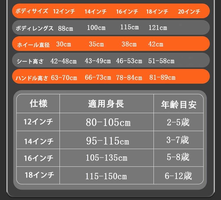 vertical-key: 12インチ(適用身長80-100cm) 14インチ(適用身長90-110cm) 16インチ(適用身長100-120cm) 18インチ(適用身長110-130cm) 20インチ(適用身長120-140cm)