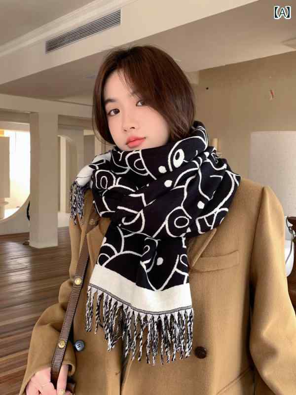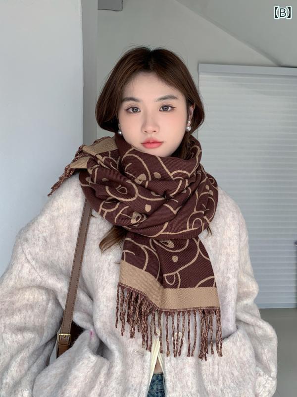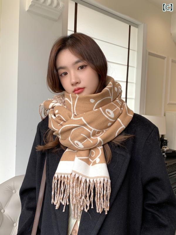 レディース ファッション 秋冬 ニット スカーフ マフラー 女性 韓国 ネックウォーマー かわいい おしゃれ 65cm×200cm クマ 両面 ショール ロング シンプル