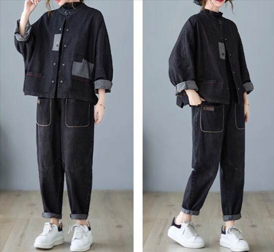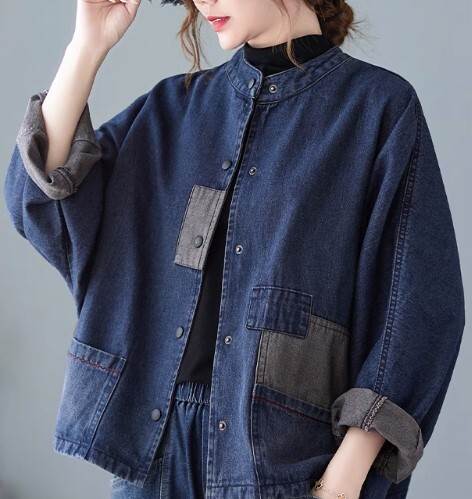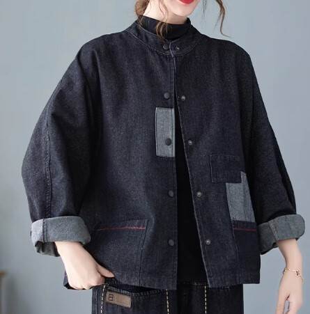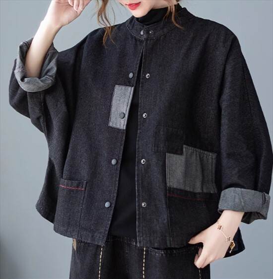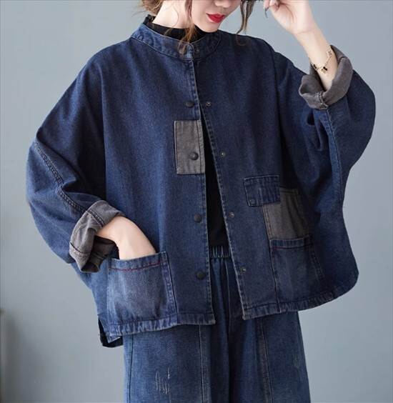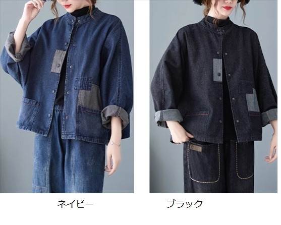 ジャケット アウター デニムジャケット カーディガン レディース ツーリングジャケット 襟なし 長袖 無地 切り替えデザイン バイカラー 春 秋 ショート丈 前開き シングルブレスト パットスリーブ スタンドカラー かわいい きれいめ 大人可愛い おしゃれ 学生 通勤 通学 個性的 ルーズ レトロ ポケット ボタン カジュアル キュートトレンディ デート お出かけ 休日 旅行 アウトドア スタイル 普段使い お散歩 主役級 ゆったり 新作 インスタ映え サイズ M L XL 色展開 ネイビー ブラック