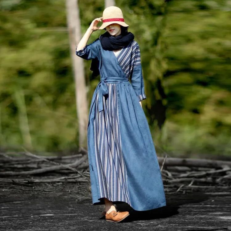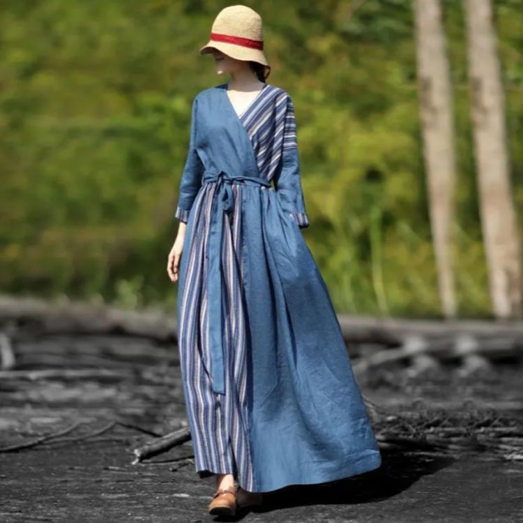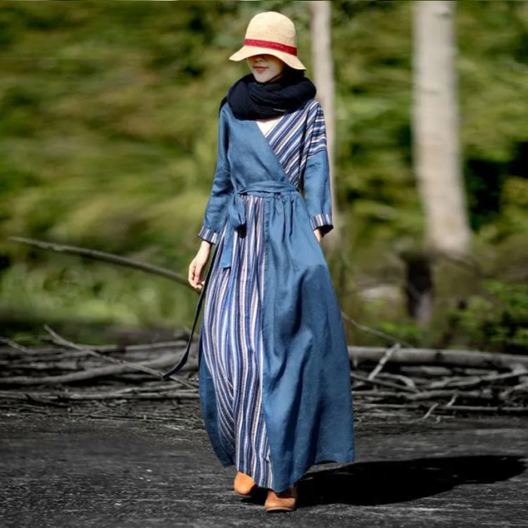 リネン ワンピース 長袖 フレア デニ