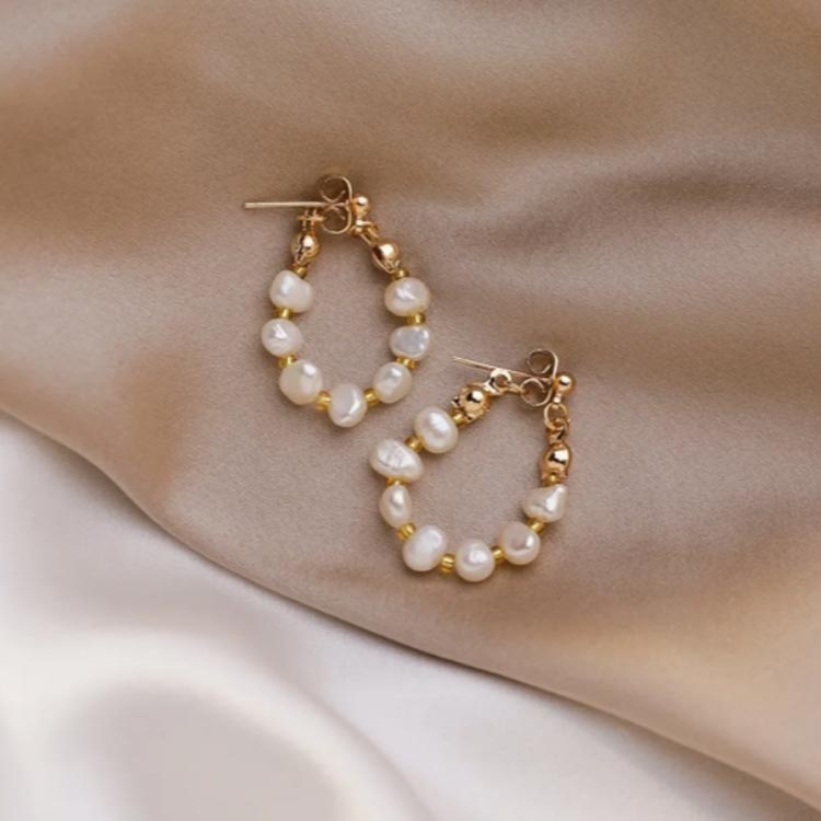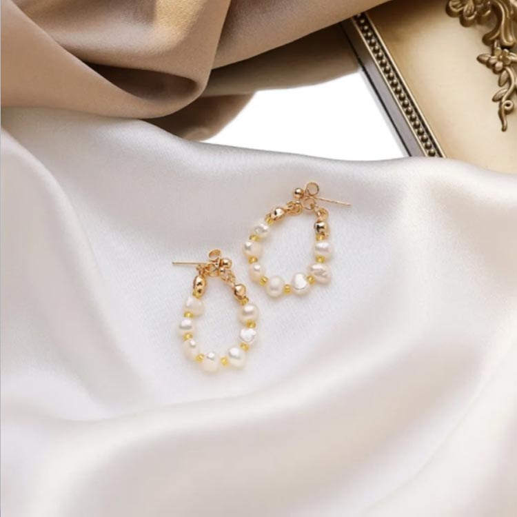 たっぷりの小粒パールを編み込んだような繊細な雰囲気のフープピアス。