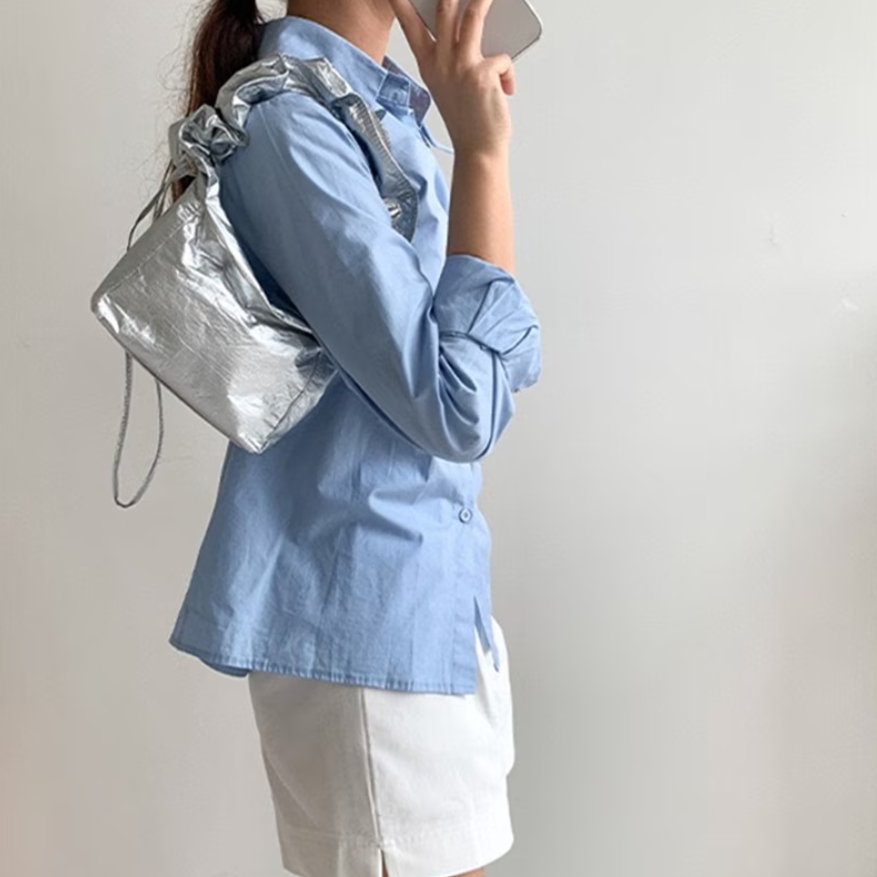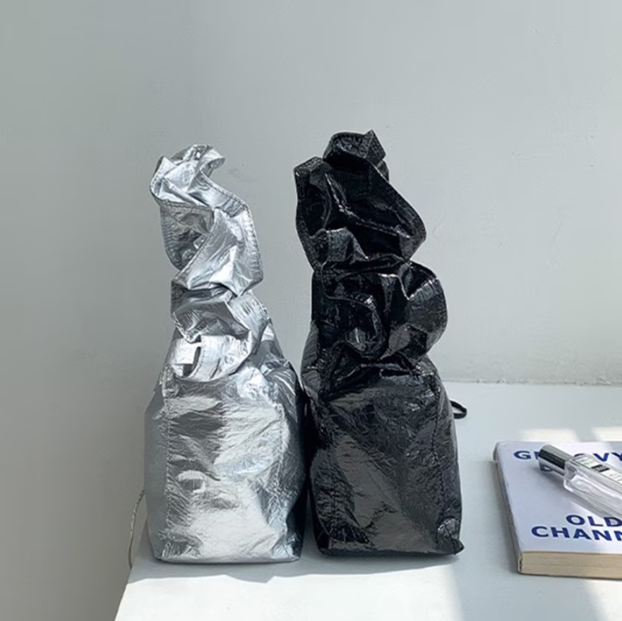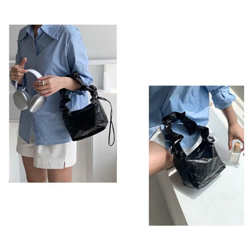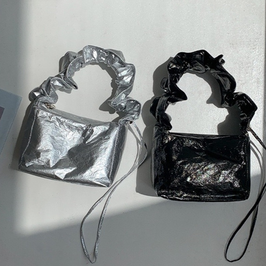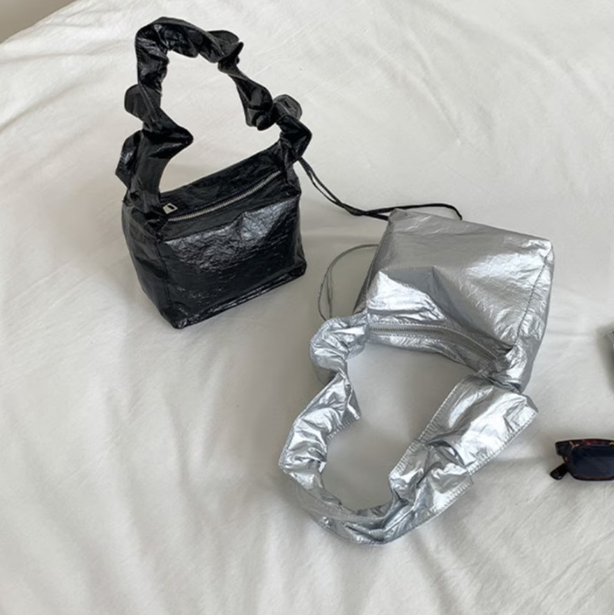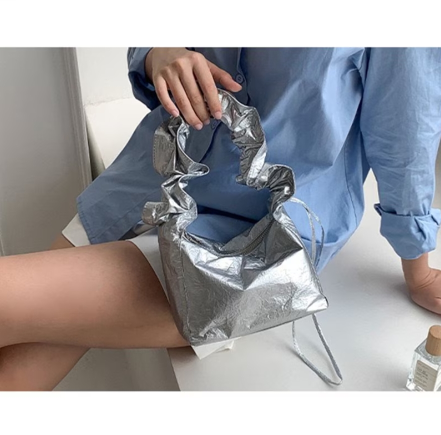 ドロストギャザーバッグ ギャザーバケットバッグ ミニハンドバッグ シルバー レディースバッグ おしゃれ 大人可愛い