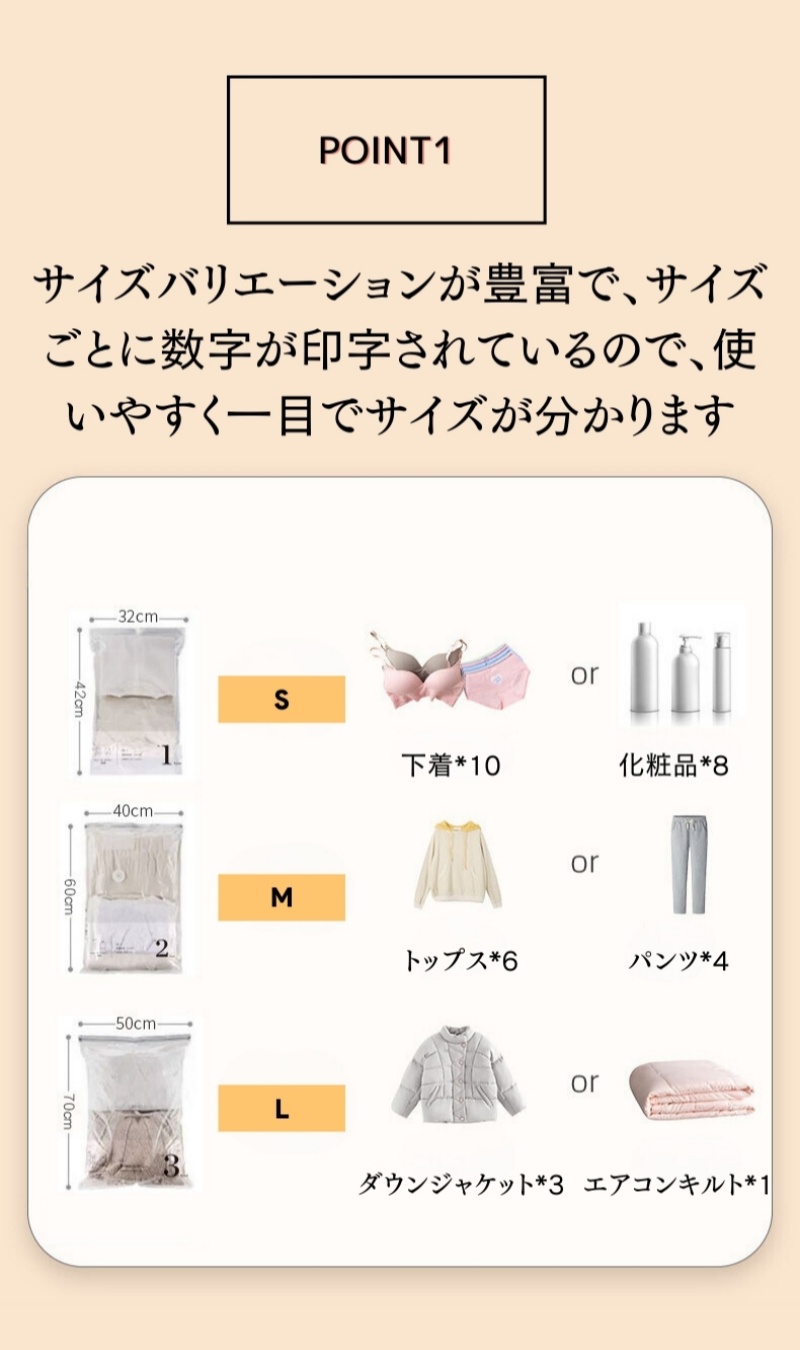 商品詳細商品名 圧縮袋サイズ S:42*32cm、M:40*60cm、L:50*70cm素材 PET+PEカラー 透明&ホワイト生産国 MADE IN PRC